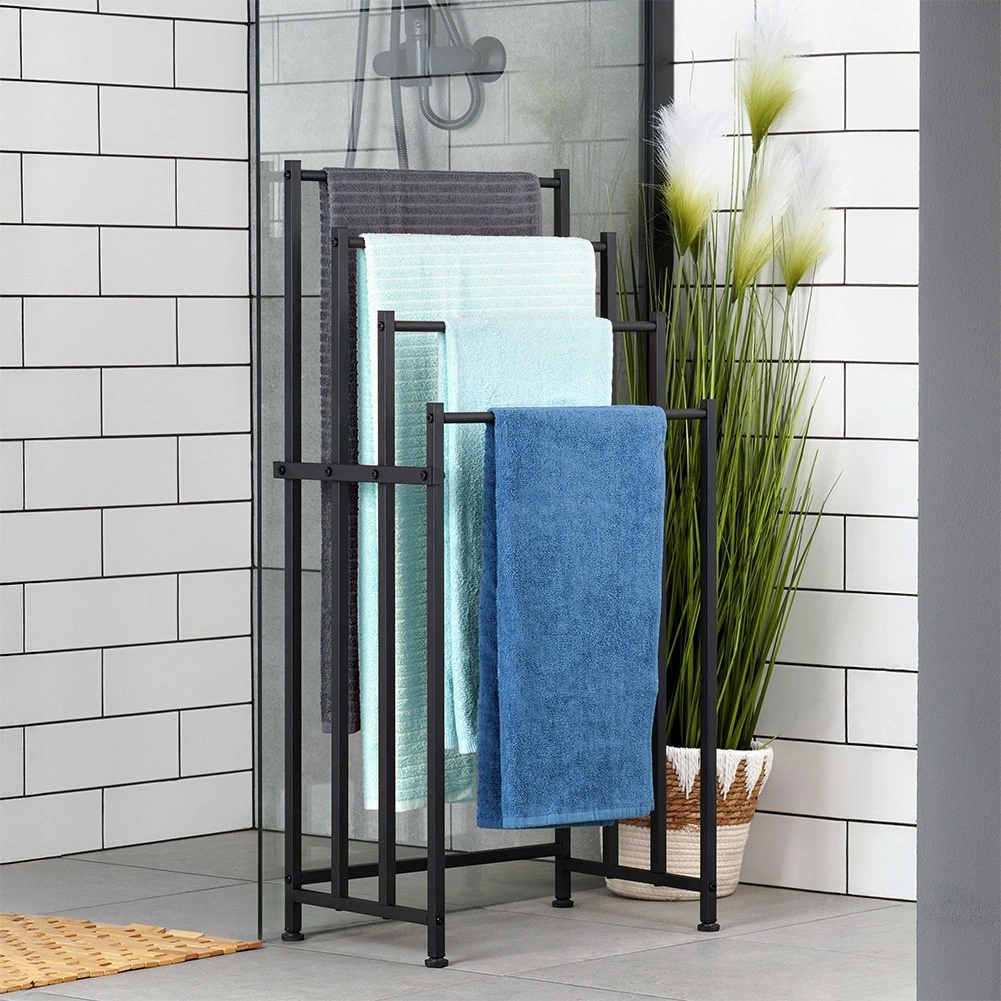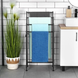 Vitka, samostoječa izvedba v loft slogu prihrani prostor in pregledno organizira brisače v vsaki kopalnici.