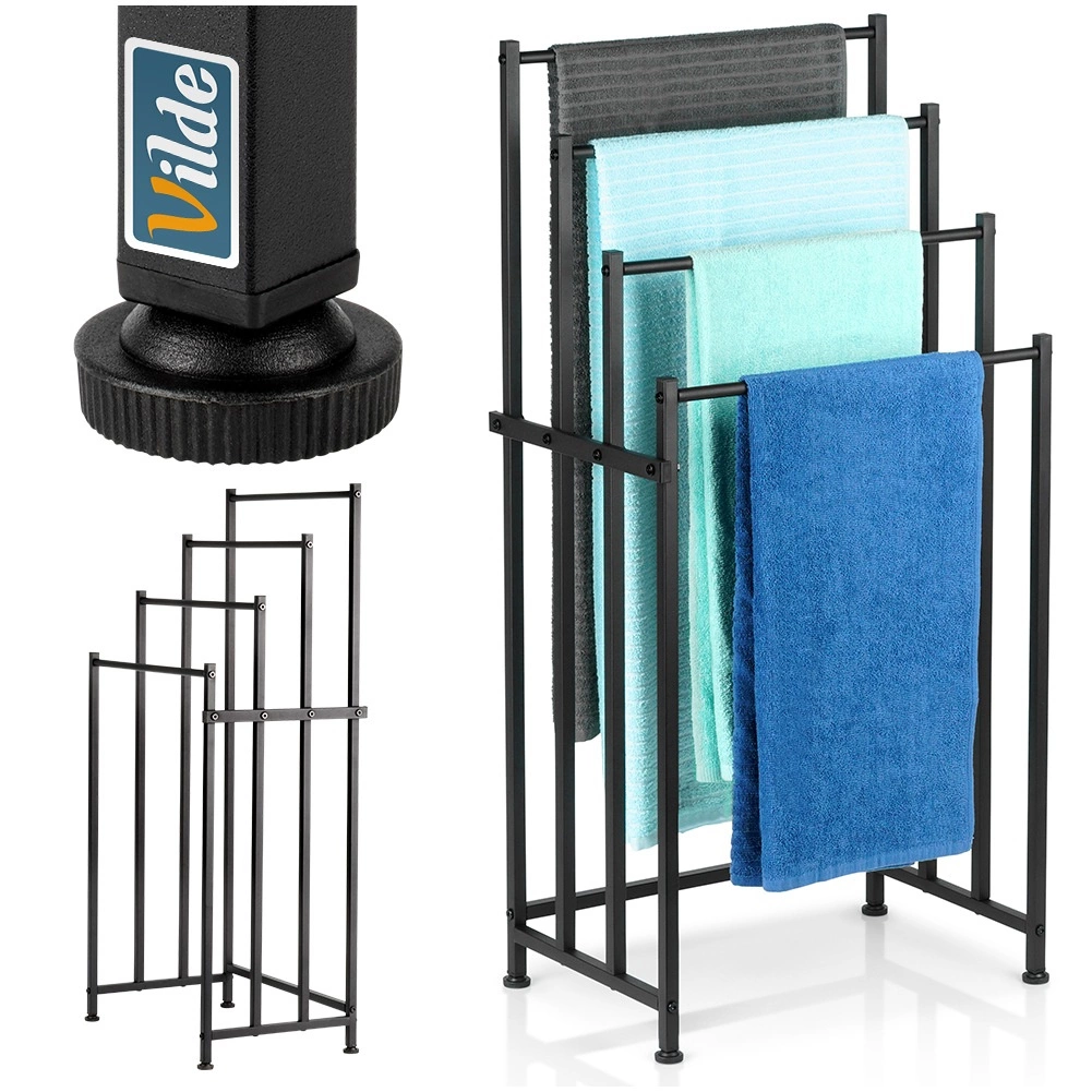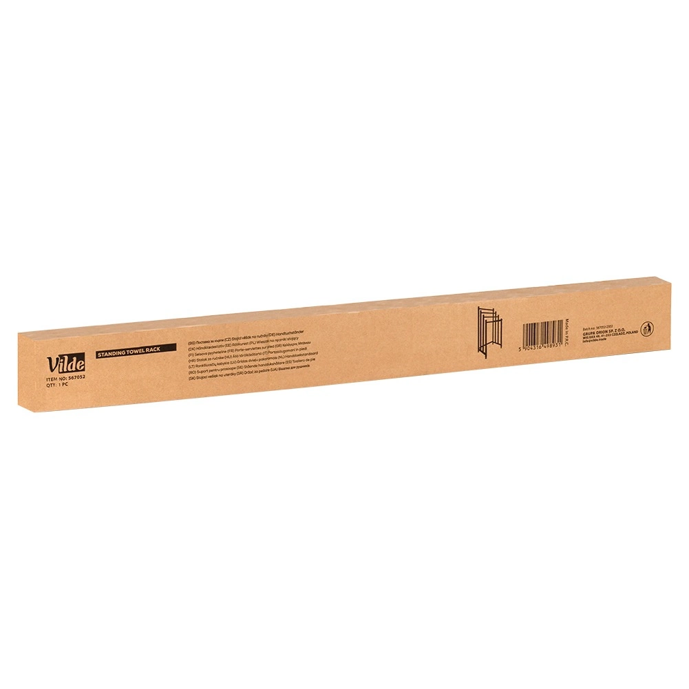 Samostoječe kovinsko stojalo za brisače Vilde je praktična rešitev za vsako kopalnico. Štiri čvrste prečke omogočajo obešanje več brisač hkrati na več nivojih za hitrejše sušenje in boljše kroženje zraka. Praškasto lakirana kovina v elegantni črni barvi vnese v interier sodoben loftovski karakter.