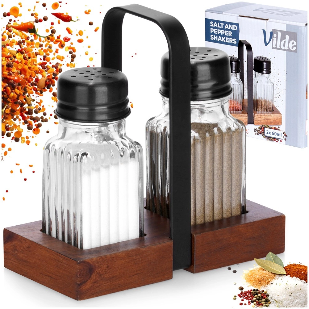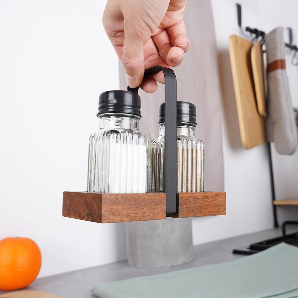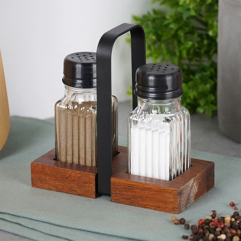 Eleganten komplet solnice in popernice v stojalu iz akacijevega lesa s kovinskim ročajem. Rebraste steklene začimbnice s črnimi navojnimi pokrovčki ponujajo udobno doziranje, preprosto prenašanje in stilizirano organizacijo na kuhinjskem pultu in na mizi.