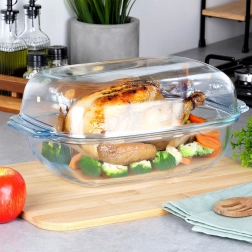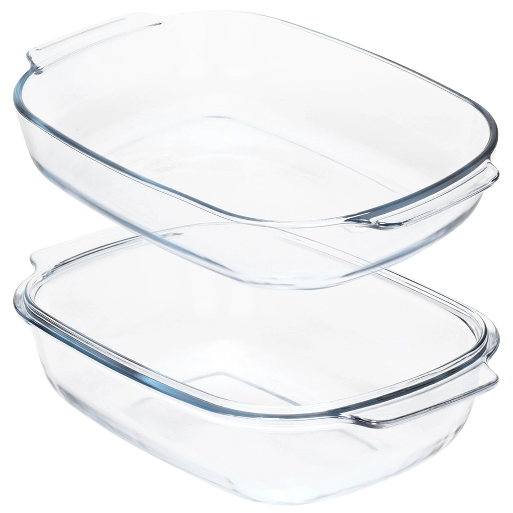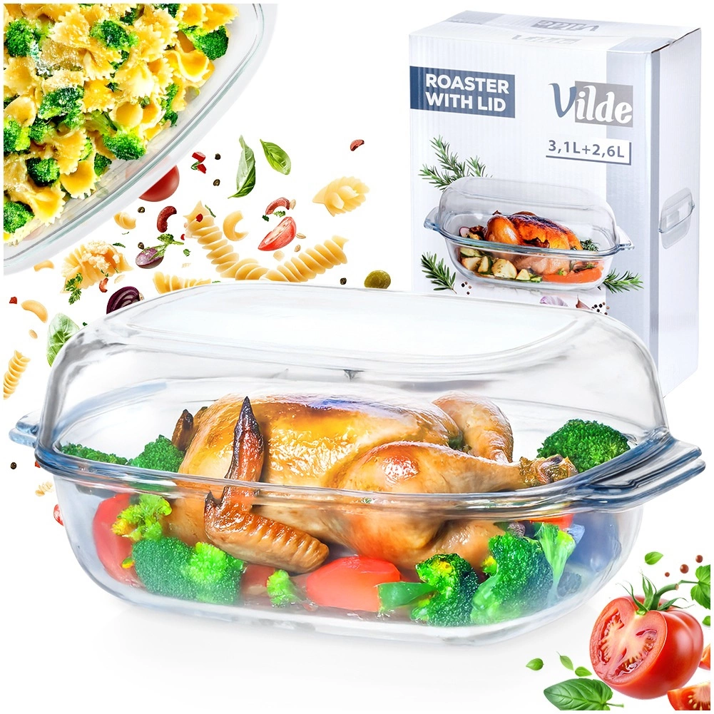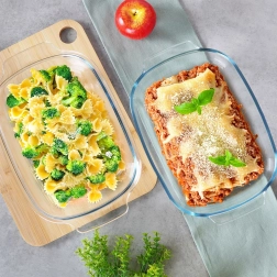 Ta dvodelni set sestavljata dva pravokotna ognjevarna pekača, ki ju lahko uporabljate ločeno ali združite – en del nato služi kot praktičen pokrov, ki ohranja vlago in sočnost jedi. Zahvaljujoč odpornemu borosilikatnemu steklu prenese temperature od -30 °C do +400 °C in je idealen za peko mesa, lazanj, krompirja, zelenjave in sladkih narastkov.