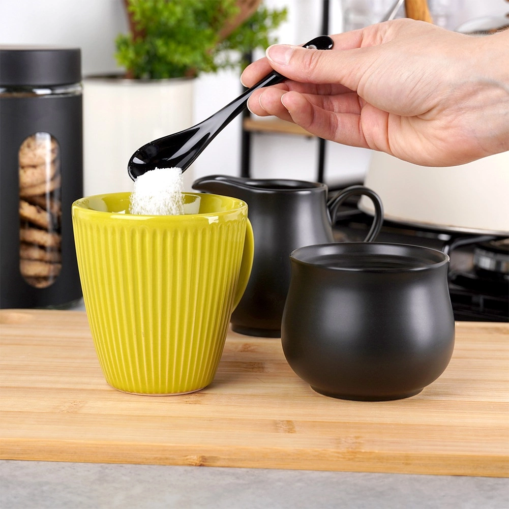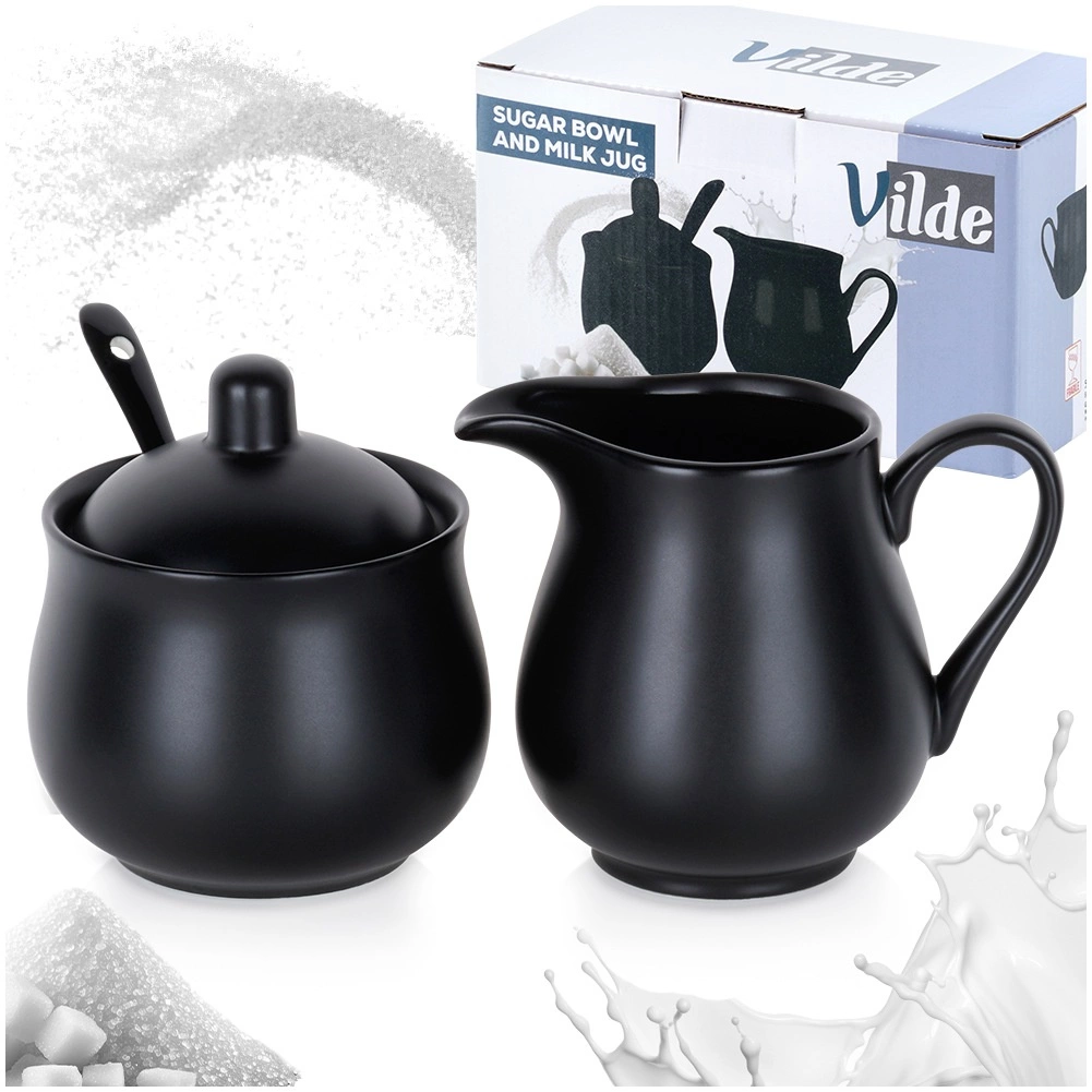 Ta tridelnI komplet združuje sodoben dizajn in vsakodnevno funkcionalnost. Vrček za mleko z ergonomskim ročajem in natančnim izlivalnikom olajša nalivanje mleka ali smetane, posodica za sladkor s pokrovom in žličko pa zagotavlja higiensko shranjevanje sladkorja. Mat črna izvedba se odlično poda k različnim vrstam namizne posode in vašemu pogrinjku doda eleganten poudarek.