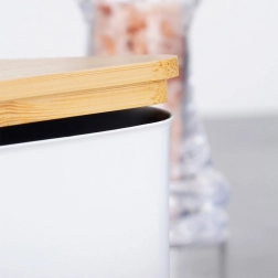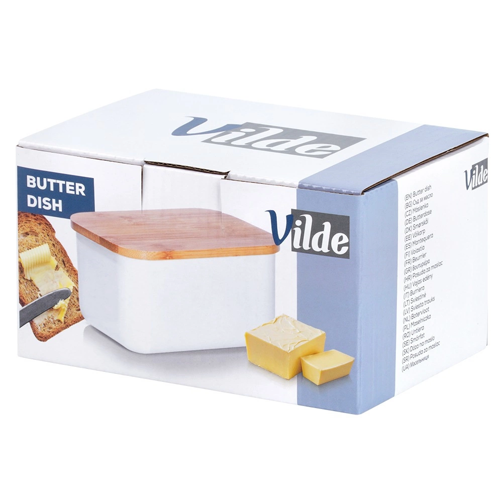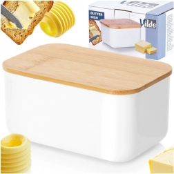 Ta praktična posoda za maslo je idealna za shranjevanje masla v hladilniku in za njegovo elegantno postrežbo na mizi. Čvrsta jeklena izvedba s prašnim lakiranjem v beli barvi ter naravni bambusni pokrov ustvarjata moderen in brezčasen videz, ki se poda k vsakemu pogrinjku.