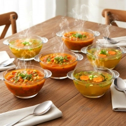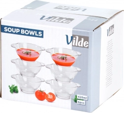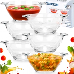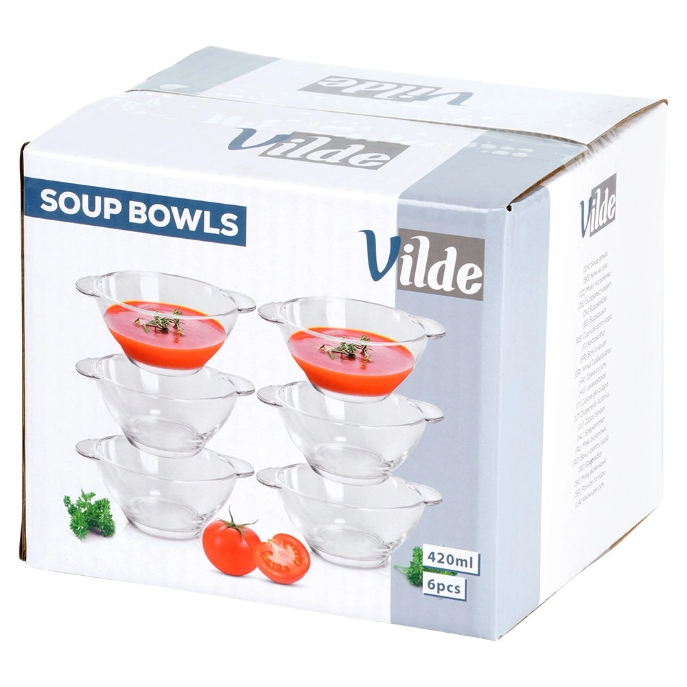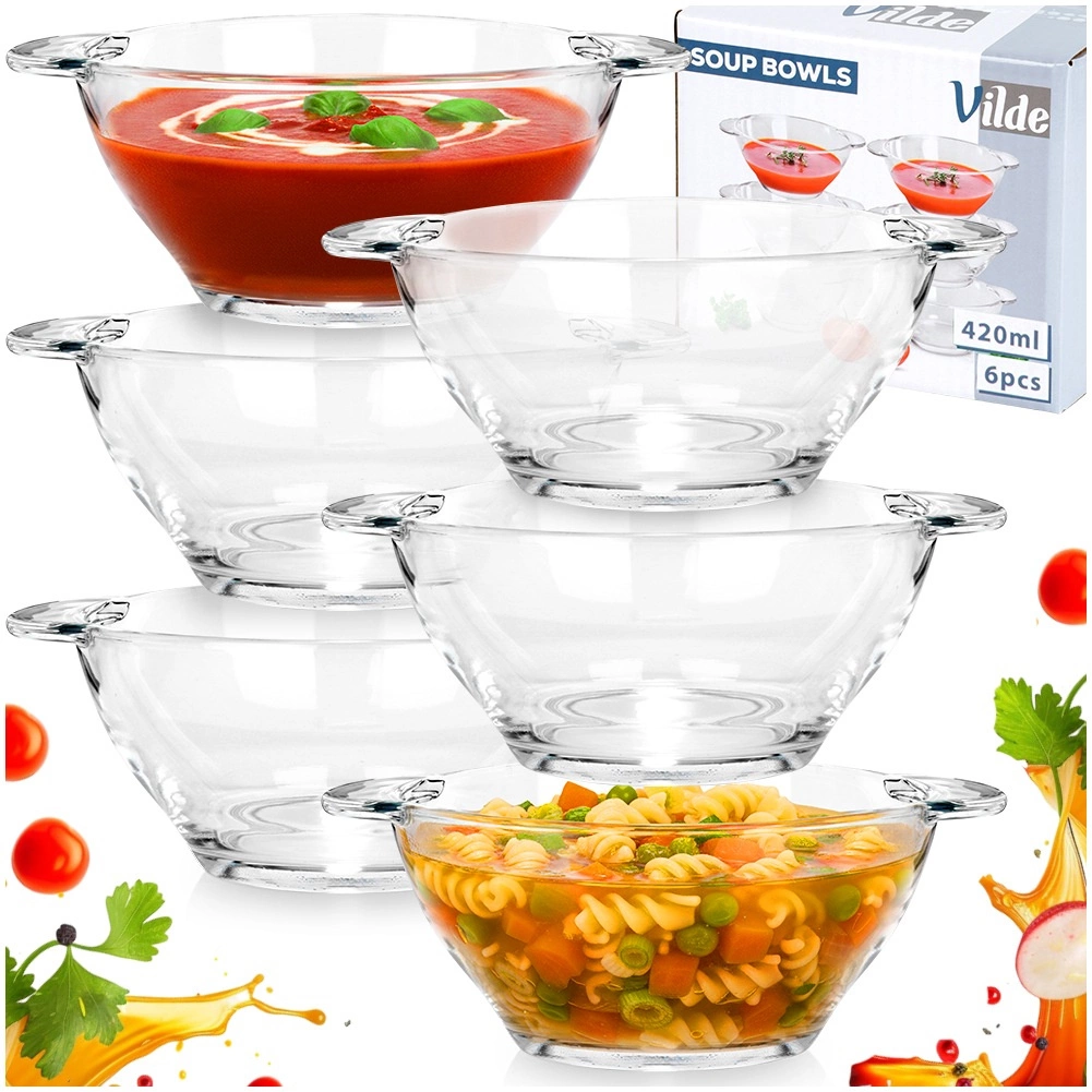 Komplet steklenih skled za juho s prostornino 420 ml je odlična izbira za vsakodnevno obedovanje in slavnostne priložnosti. Prosojno steklo poudari barve in strukturo vaših jedi, zato juhe, kreme in sladice vedno izgledajo privlačno. Zaradi klasične oblike se sklede zlahka kombinirajo s katerim koli jedilnim servisom.