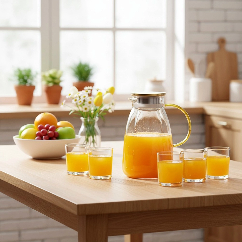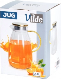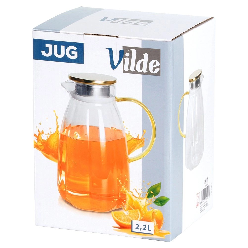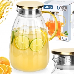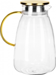 Slogoven in praktičen stekleni vrč, ki izstopa na vsaki mizi. Prosojno, kakovostno debelostensko steklo lepo prikaže limone, zelišča ali kocke ledu, medtem ko zlati nerjaveč pokrov ščiti pijačo pred nečistočami in insekti. Ergonomski rumeni ročaj in oblikovan vrat zagotavljata varno in natančno točenje brez kapljanja.