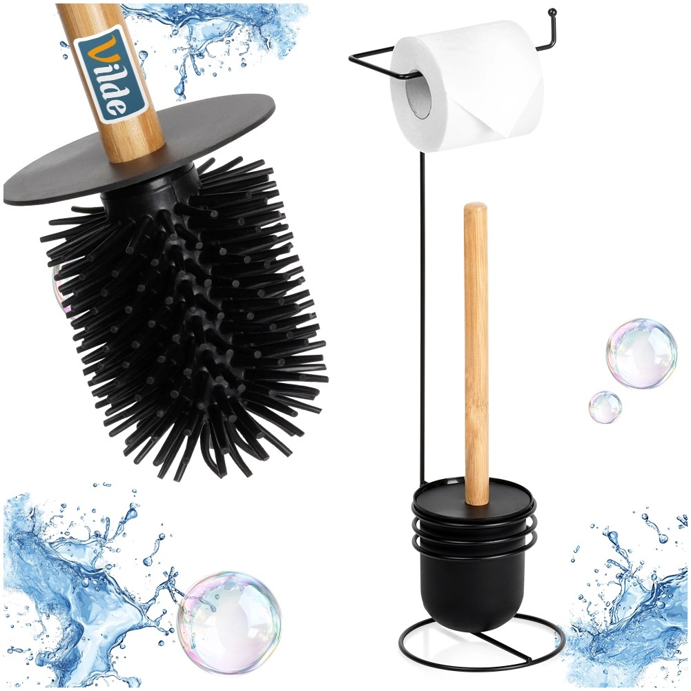 Praktično in elegantno 2‑v‑1 stojalo za kopalnico združuje držalo za toaletni papir in WC ščetko v eni kompaktni konstrukciji. Zaradi samostoječe zasnove ne zahteva montaže in ga lahko postavite kamor koli. Kombinacija črnega kovinskega ogrodja, bambusovega ročaja in silikonskih ščetin zagotavlja preprosto vzdrževanje, vzdržljivost in moderen videz.