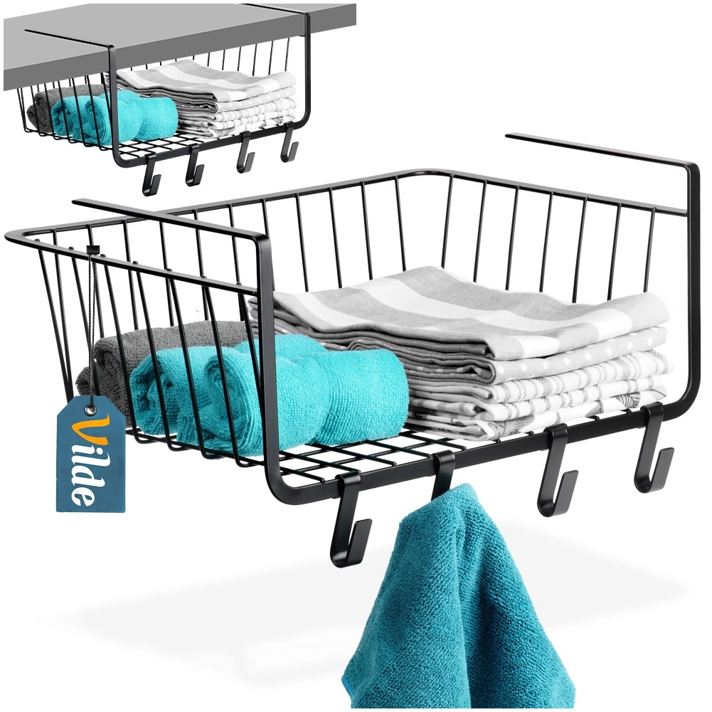 Praktična viseča košara pod polico z merami 40,5 × 26 × 16 cm razširi shranjevalni prostor brez vrtanja. V kompletu so štirje kavlji za obešanje krp ali dodatkov. Košara je iz odoljnega kovina v črni barvi, ima univerzalno uporabo v kuhinji, kopalnici, garderobi in pisarni ter omogoča hitro, brezorodjarsko namestitev.