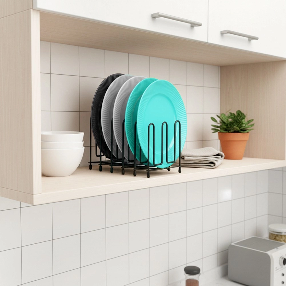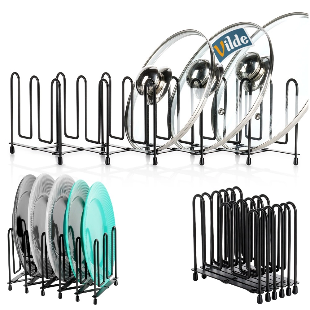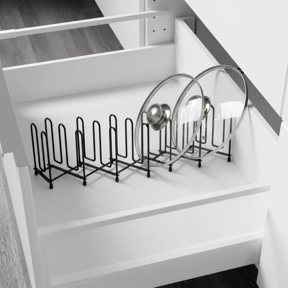 Ohranite red v kuhinji z univerzalnim organizatorjem za pokrovke, krožnike in rezalne deske. Stojalo se enostavno prilagodi prostoru in vsebini – od dolžine 8 cm do 74 cm. Idealno za kuhinjski pult, omarico ali globoke predale. Navpično shranjevanje zagotavlja boljši pregled, hiter dostop in zaščito robov ter površin.
