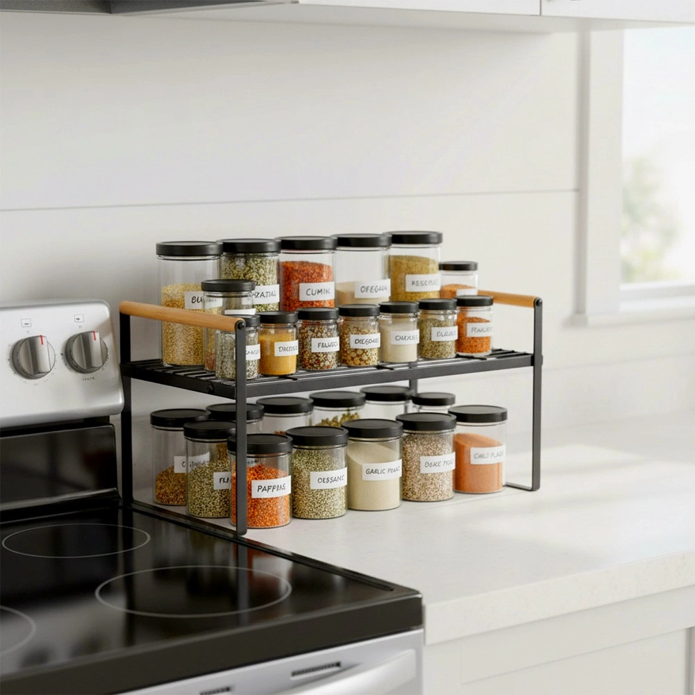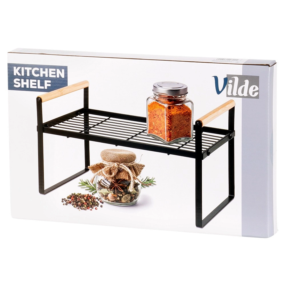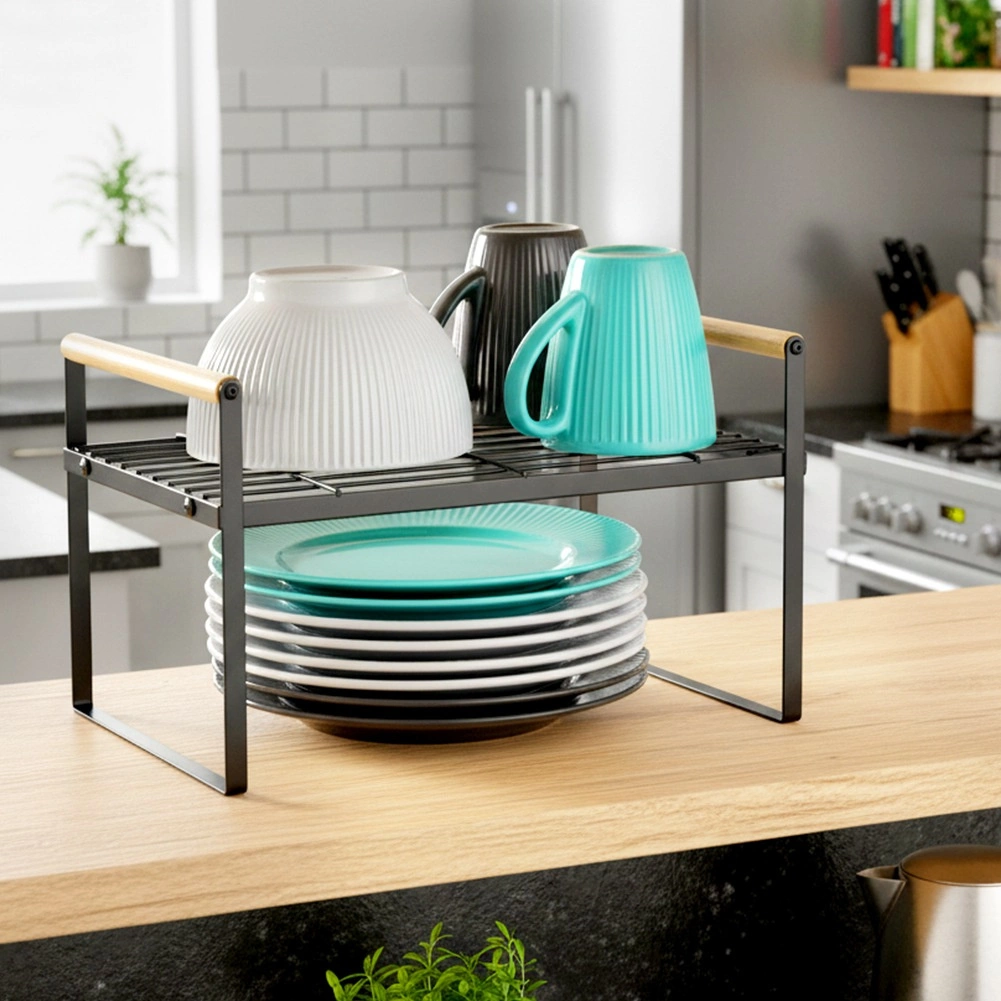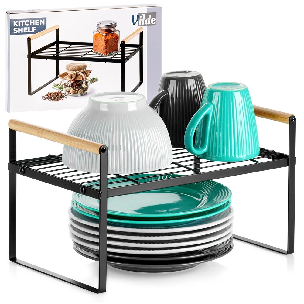 Praktična kuhinjska polica za boljšo organizacijo prostora v kuhinji in gospodinjstvu. Ponuja prihranek prostora, stabilno kovinsko konstrukcijo v črni barvi in bambusaste ročaje. Zaradi mer 33 × 21 × 19,5 cm učinkovito razdeli omarico na dve ravni in omogoča pregledno shranjevanje začimb, krožnikov, skodelic ali skled.