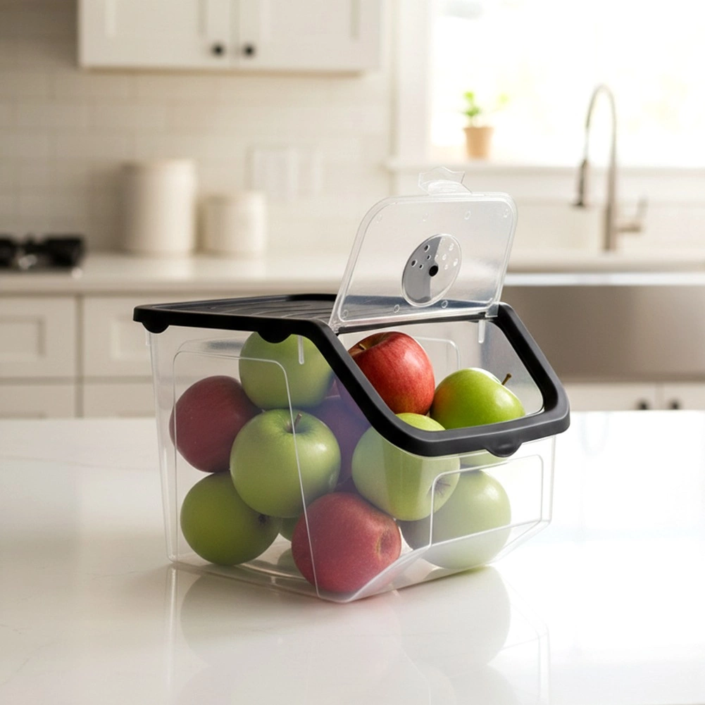 Ohranite red v kuhinji z univerzalnim zabojem s prostornino 12 l, idealnim za shranjevanje čebule, krompirja, česna, sadja in sipkih živil. Zahvaljujoč prozorni izvedbi imate vsebino vedno pod nadzorom, pokrov z nagibno loputo pa omogoča hiter dostop brez odpiranja celotne posode.
