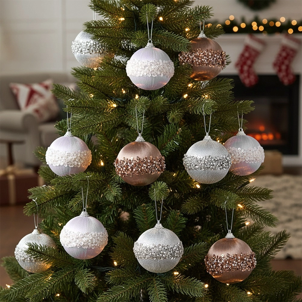 Eleganten komplet božičnih krogel premera 8 cm v odtenkih bela, srebrna in šampanjska. Vsaka krogla je lahka in netlomljiva, s polistirenskim jedrom, prevlečena s satenasto tkanino in okrašena s širokim trakom bleščečih kroglic in bleščic za razkošen videz. Idealne za božično drevo, vence in praznične aranžmaje ter odličen namig za darilo.