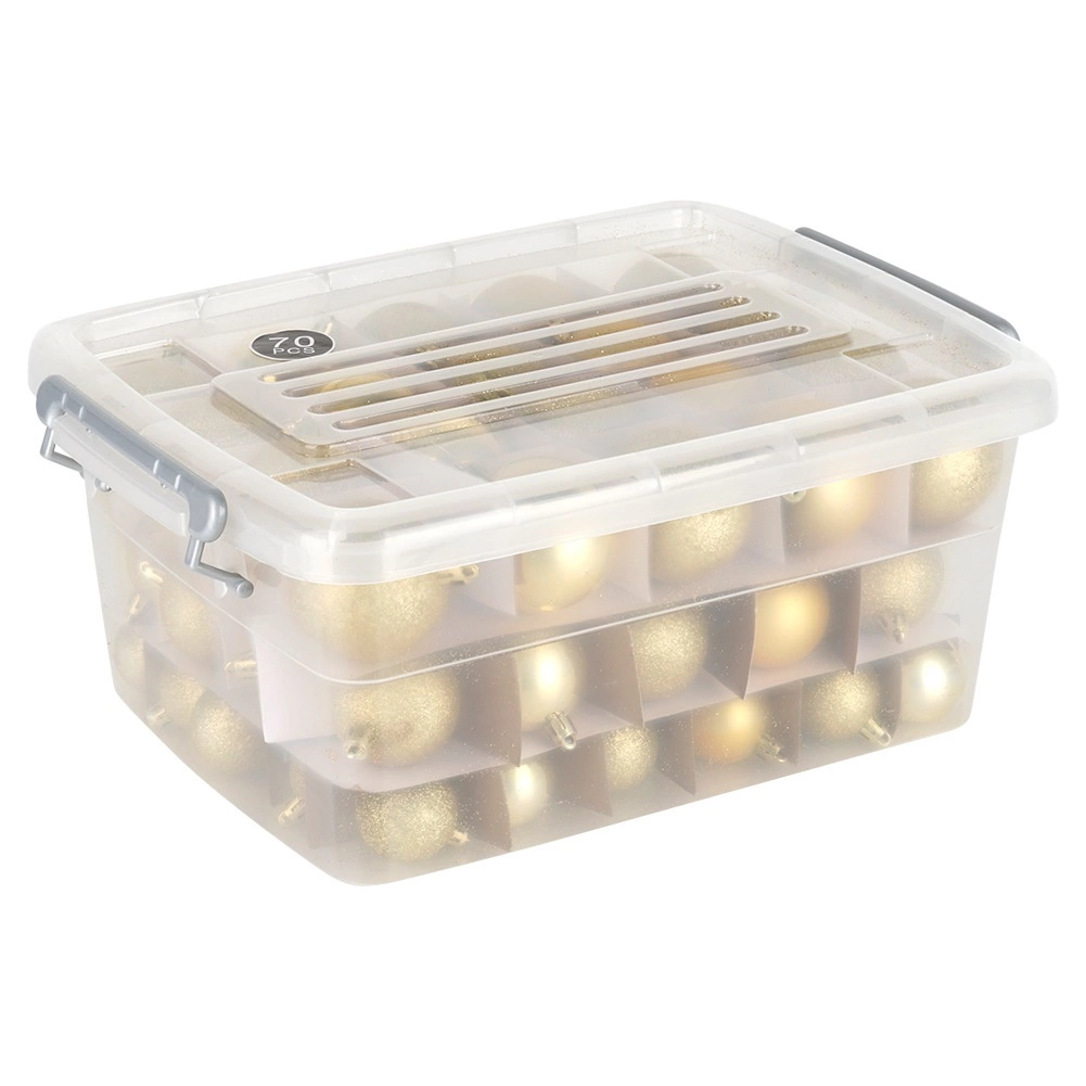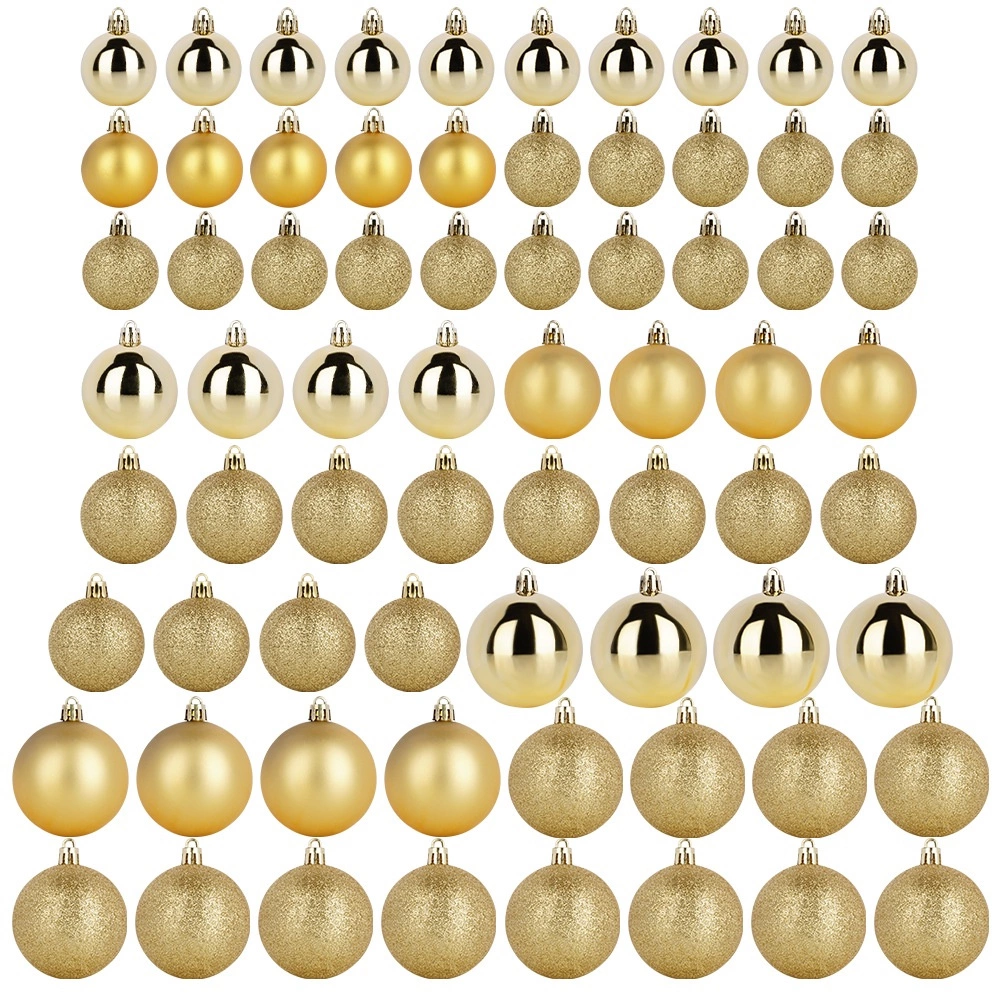 Stajliš set božičnih okraskov za popolno okrasitev: 70 nerazbitnih zlatih krogel v treh velikostih in treh površinskih obdelavah (mat, sijaj, bleščice) v praktičnem shranjevalnem boxu. Varno za otroke in hišne ljubljenčke, odporno proti razbitju in idealno za harmonično ter elegantno dekoracijo vsake smrečice.