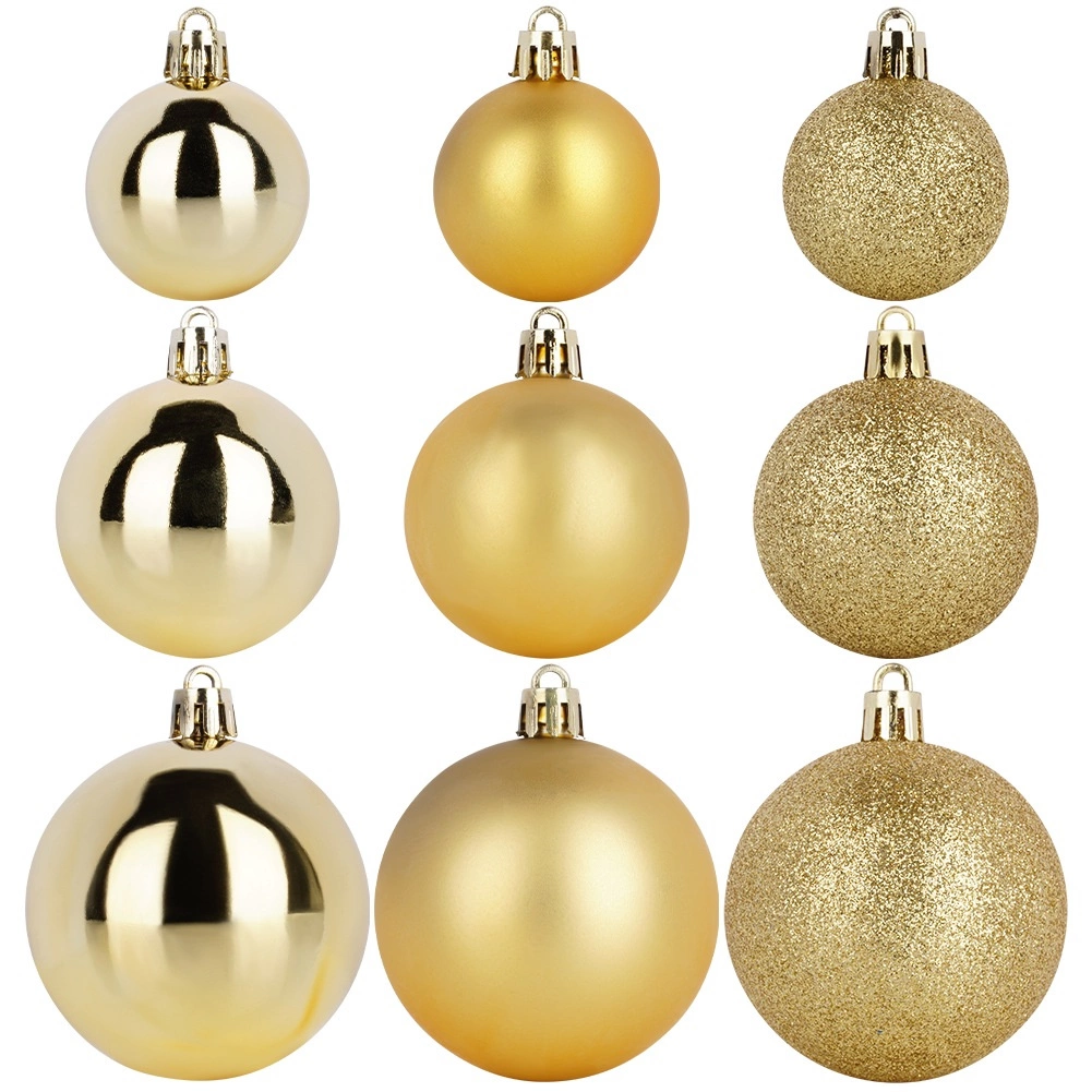 Ustvarite enotno, a dinamično božično okrasitev z setom zlatih krogel, ki kombinirajo različne premere in površinske teksture. Nerazbitni okraski iz kakovostne plastike so lahki, varni in trpežni, zato so odlični za družine z otroki in hišnimi ljubljenčki.