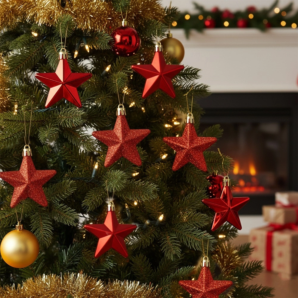 Elegantni komplet vsebuje 8 rdečih zvezdastih okraskov s premerom 6,5 cm v sijajni, mat in bleščeči izvedbi. Zaradi odpornega materiala so nerazbitni, varni za otroke in hišne ljubljenčke ter idealni za božično drevo, vence ali praznične dekoracije. V pakiranju so priložene tudi vrvice za obešanje.