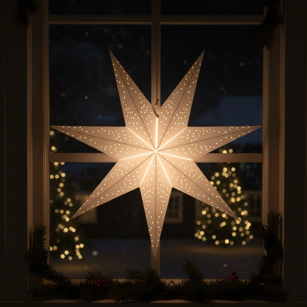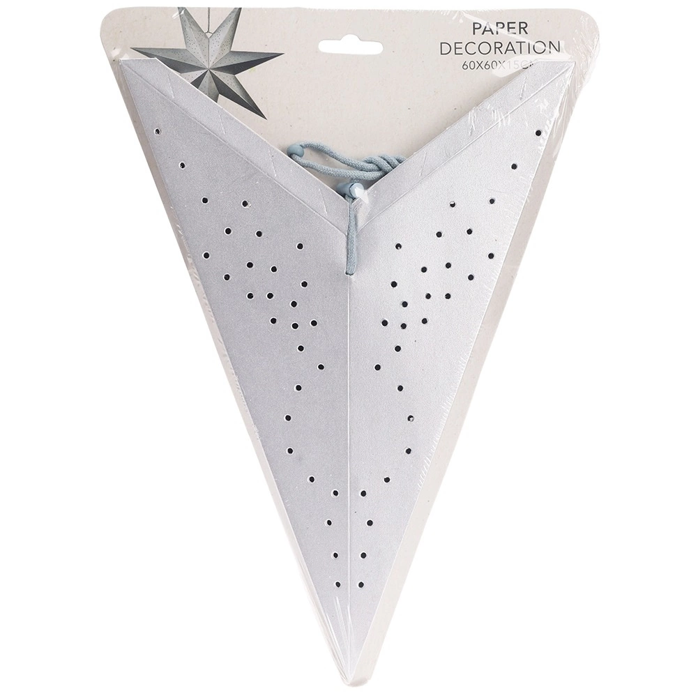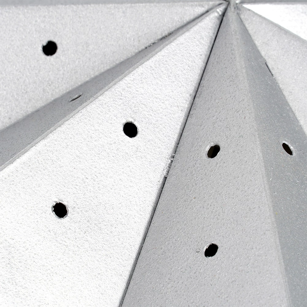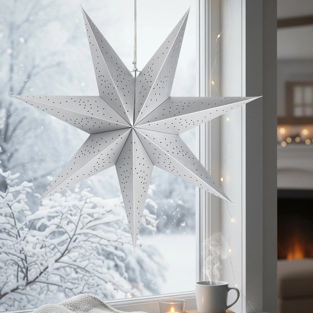 Ta velika srebrna papirnata zvezda z ažur (perforiranim) motivom deluje lahkotno in zračno ter takoj pričara praznično ali vsakodnevno čarobnost v notranjosti. Sedemkraka oblika in 3D konstrukcija zagotavljata efektni videz z vseh strani. Zaradi majhne teže jo zlahka obesite na okno, steno ali pod strop.