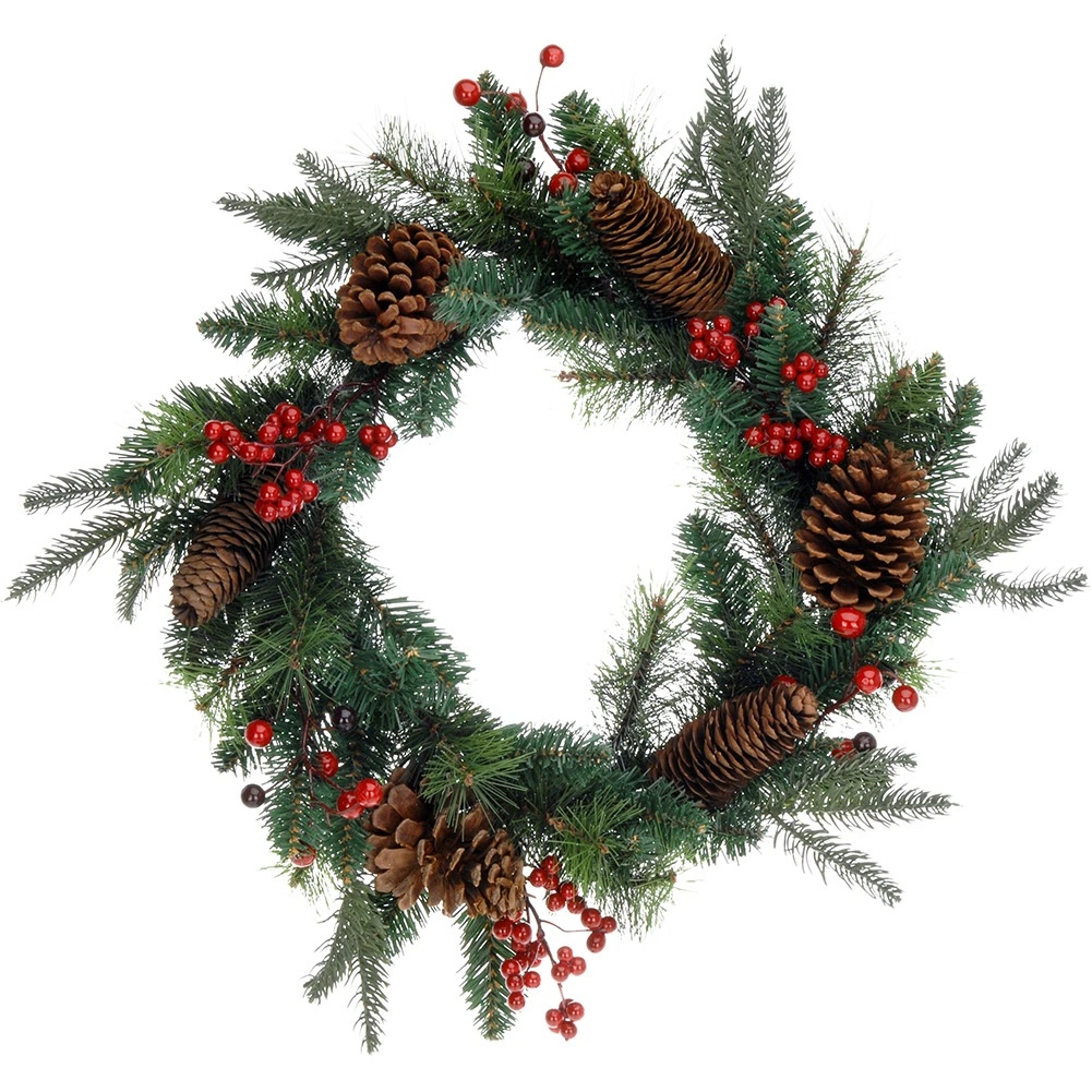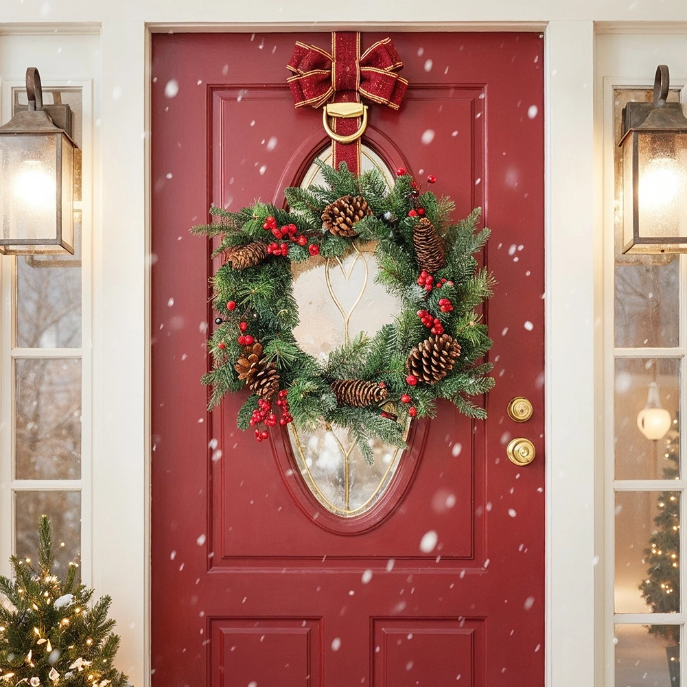 Bogata kompozicija naravnih okraskov – okrogli in podolgovati storži ter vejice z rdečimi jagodami – dekoraciji doda gozdni, eleganten in resnično božični značaj. Venec je vsestranski: čudovito izstopa na vhodnih vratih, nad kaminom ali kot namizno središče s svečami.