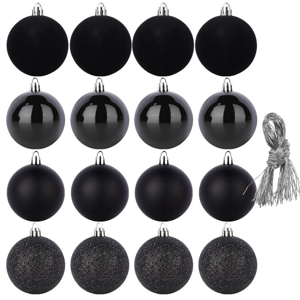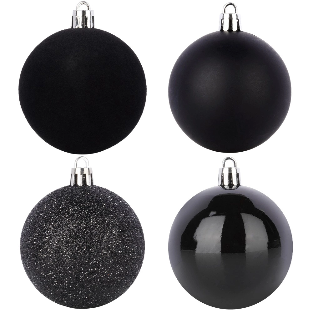 Elegantni komplet črnih božičnih krogel za vašo praznično dekoracijo. Vsebuje 16 kosov s premerom 8 cm v različnih površinskih obdelavah – mat, sijaj, bleščeče in žametne. Zahvaljujoč nerazbitnemu materialu so varne za gospodinjstva z otroki in hišnimi ljubljenčki ter vašemu božičnemu drevesu dodajo stajliš in moderen videz.