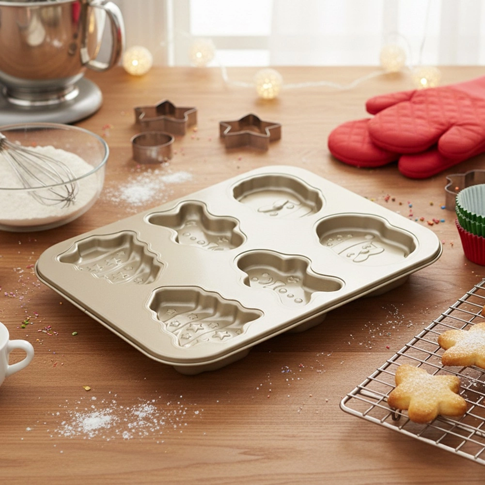 Ta elegantni pekač v odtenku šampanjskega zlata ponuja 6 vdolbin s tremi priljubljenimi božičnimi motivi. Odličen je za medenjačke, krhke piškote, pa tudi za mini cheesecake ali cupcake. Jekleno telo poskrbi za stabilnost in enakomerno peko, neprijemljiva PTFE površina pa za preprosto odstranjevanje brez strganih robov.