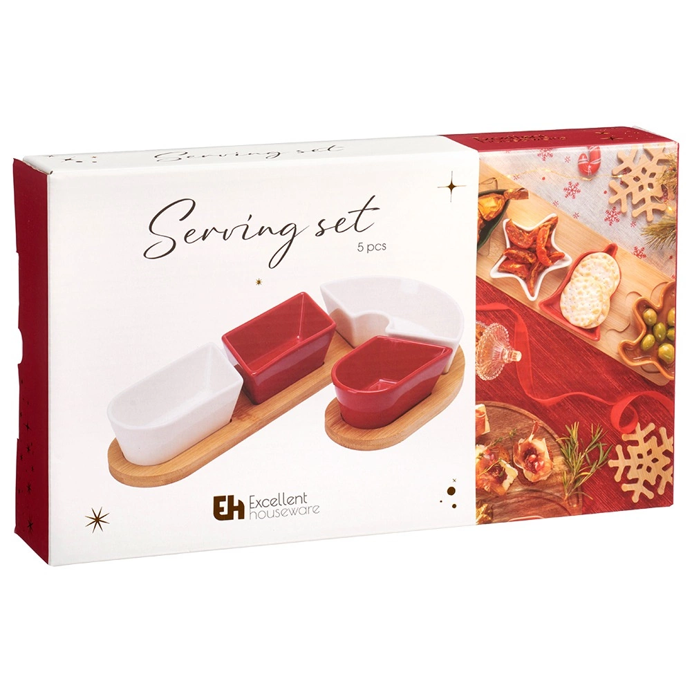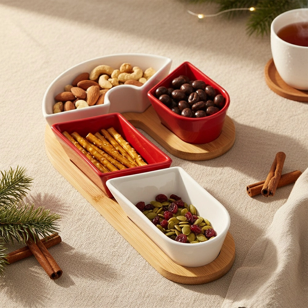 Ustvarite neponovljivo praznično vzdušje z elegantnim servirnim kompletom v obliki sladkorne palice. Keramične skodelice v klasični kombinaciji bele in rdeče barve odlično dopolnijo vašo mizo, medtem ko bambusova deska z izrezkanimi ležišči vse varno drži na mestu. Praktična in dekorativna rešitev za družinske večerje, obiske in božične zabave.