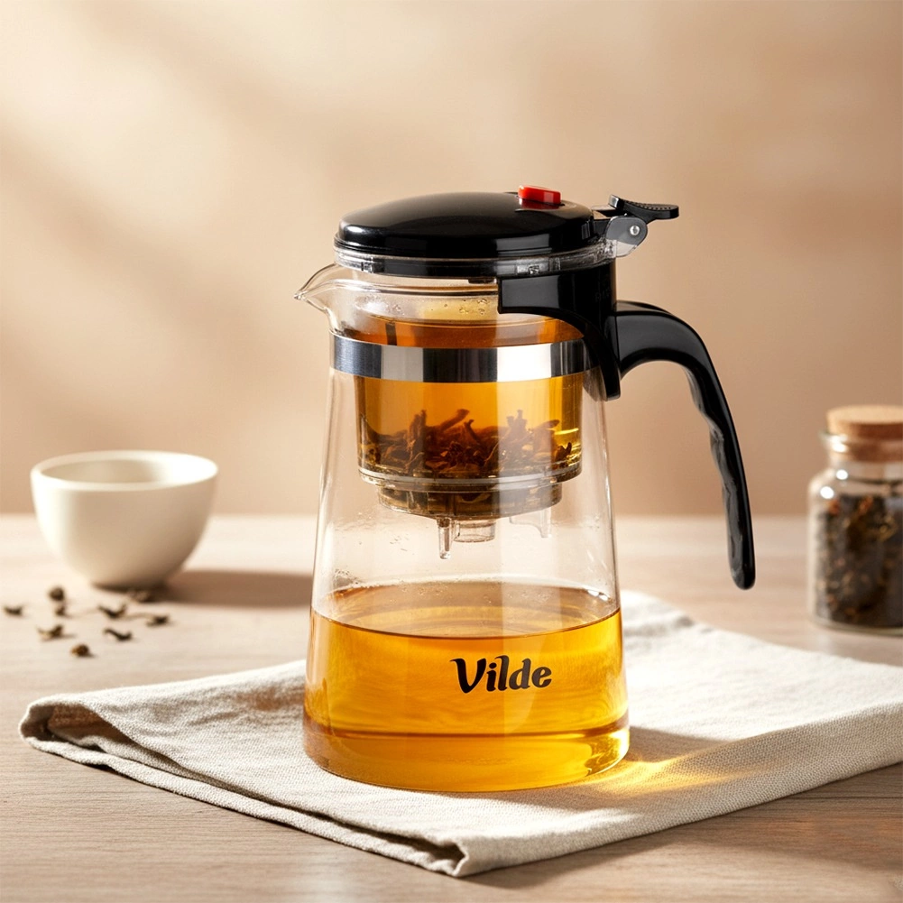 Čajnika je izdelana iz borosilikatnega stekla, ki je lahko, odporno in prenaša nenadne temperaturne spremembe. Prozorno telo omogoča natančen nadzor barve in intenzivnosti napitka, plastična pokrova in prelivnik pa olajšajo varno in udobno uporabo.