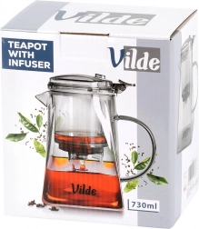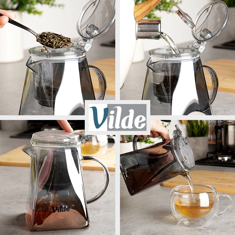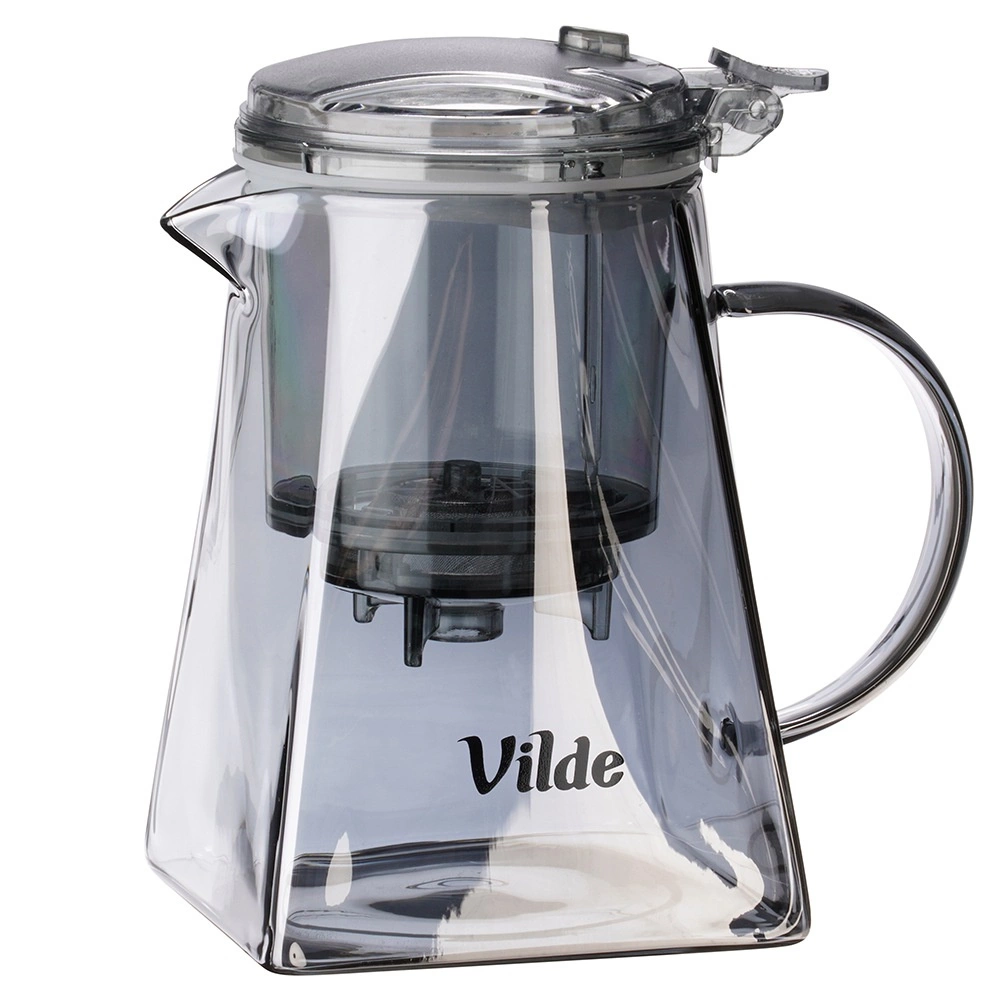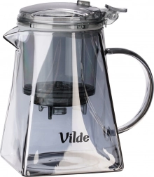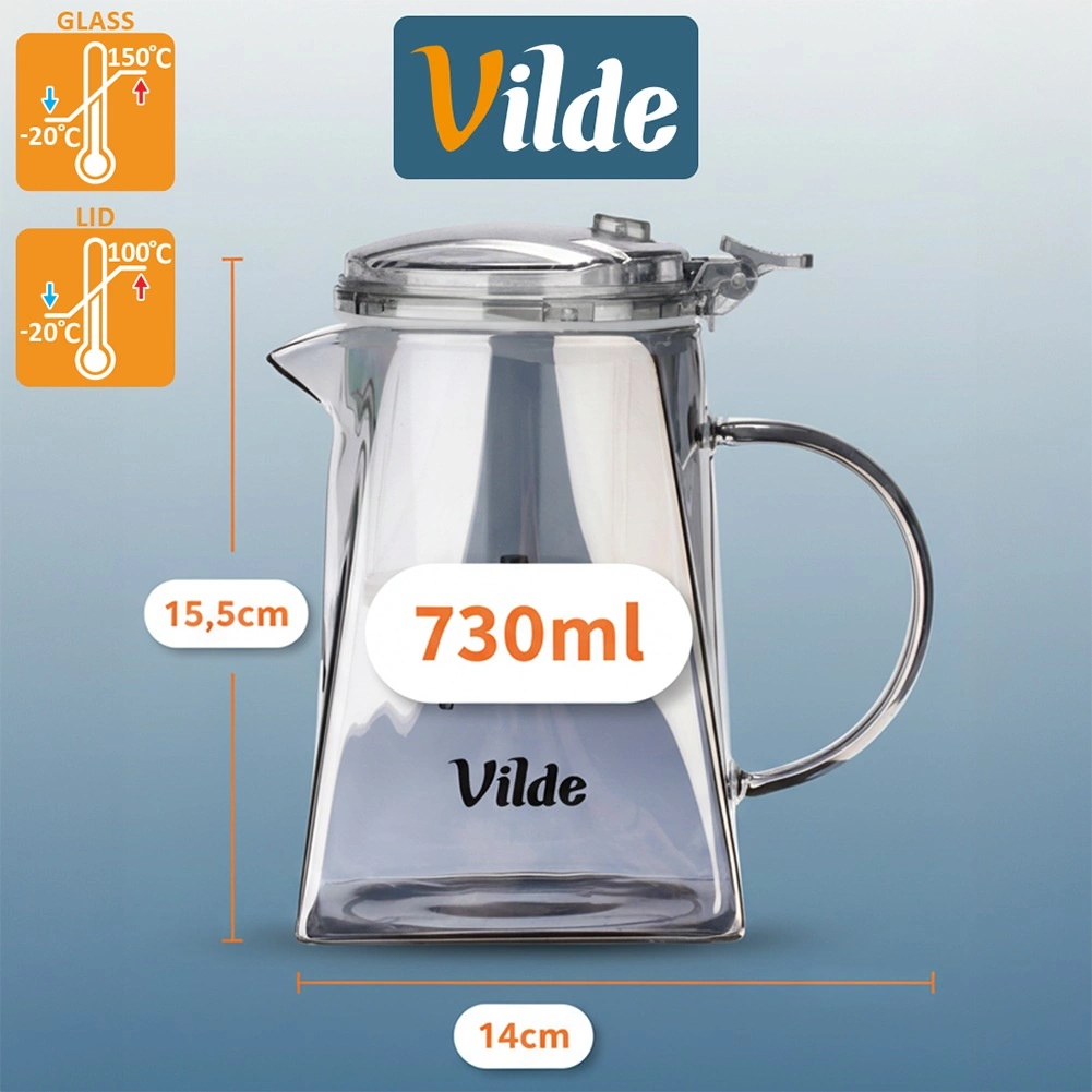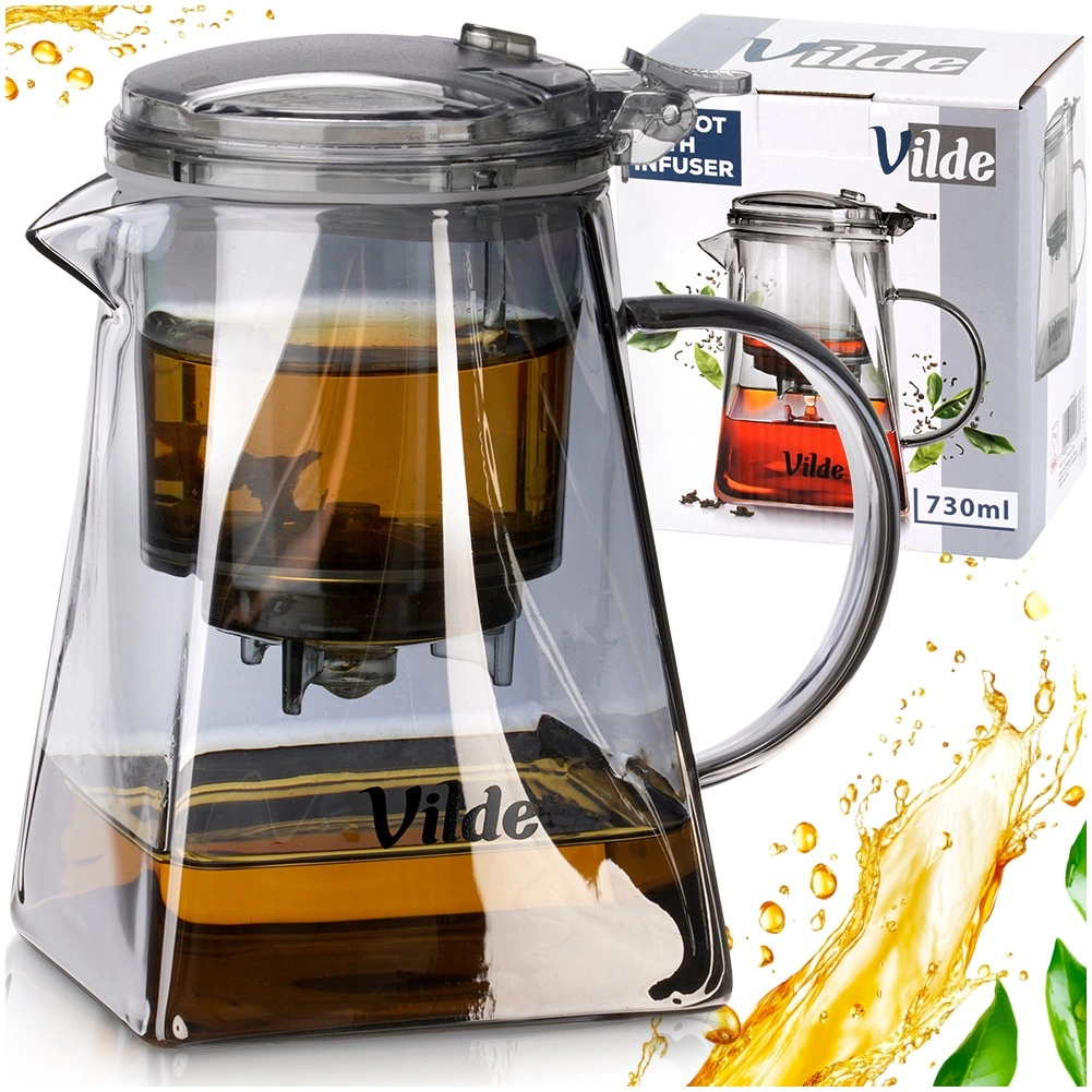 Ohišje iz borosilikatnega stekla je lahko, trdno in temperaturno odporno. Kvadratni tloris s stožčasto obliko zagotavlja stabilnost in izviren videz. Praktičen pokrov in namakalnik iz kakovostne plastike sta prosojna v dimno črnem odtenku. Široko grlo olajša polnjenje in čiščenje, ergonomski ročaj pa udobno nalivanje.