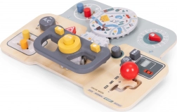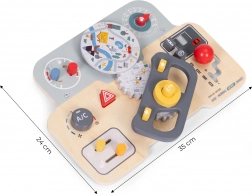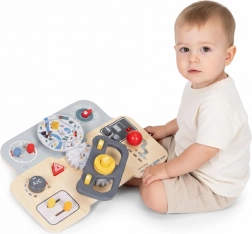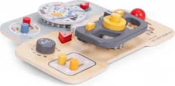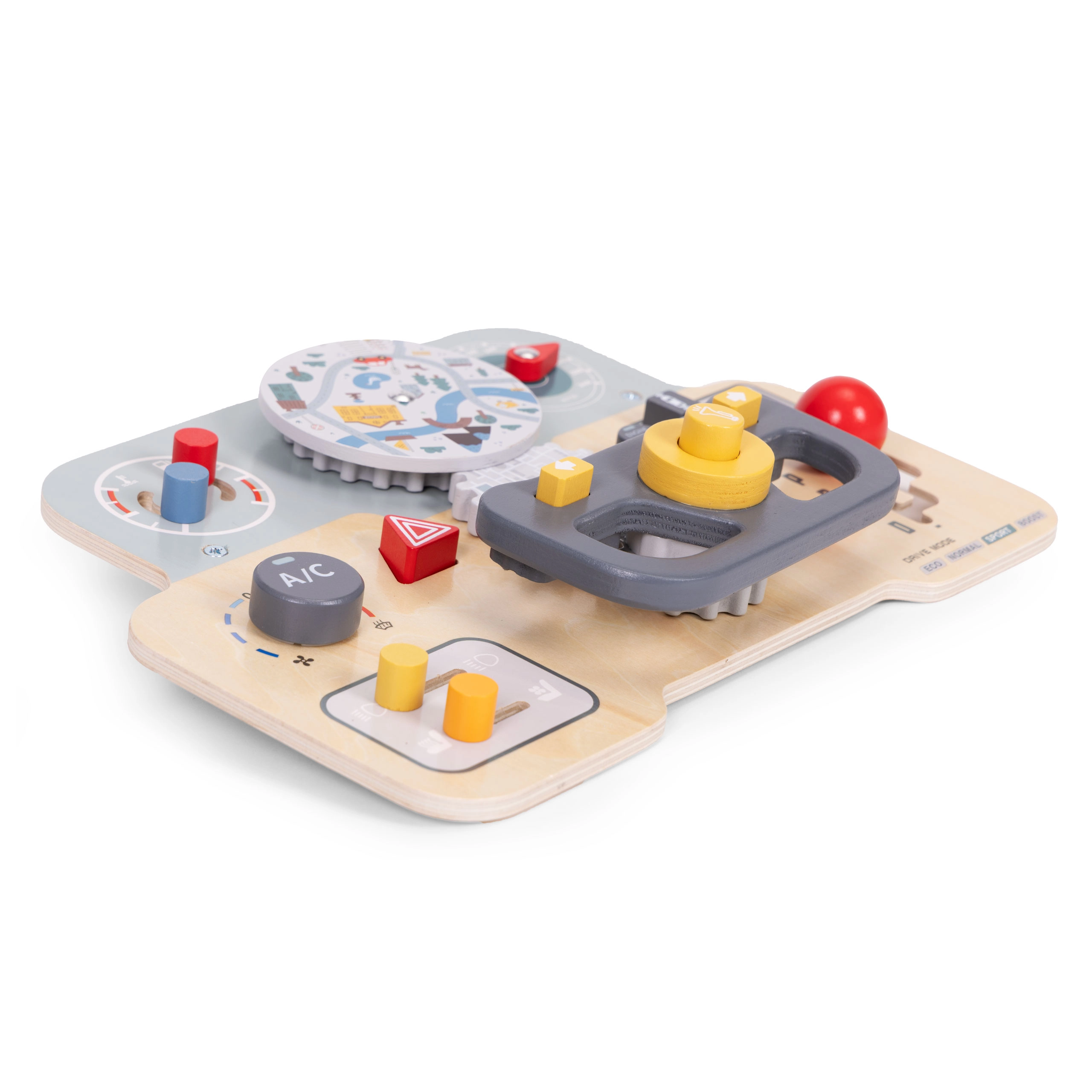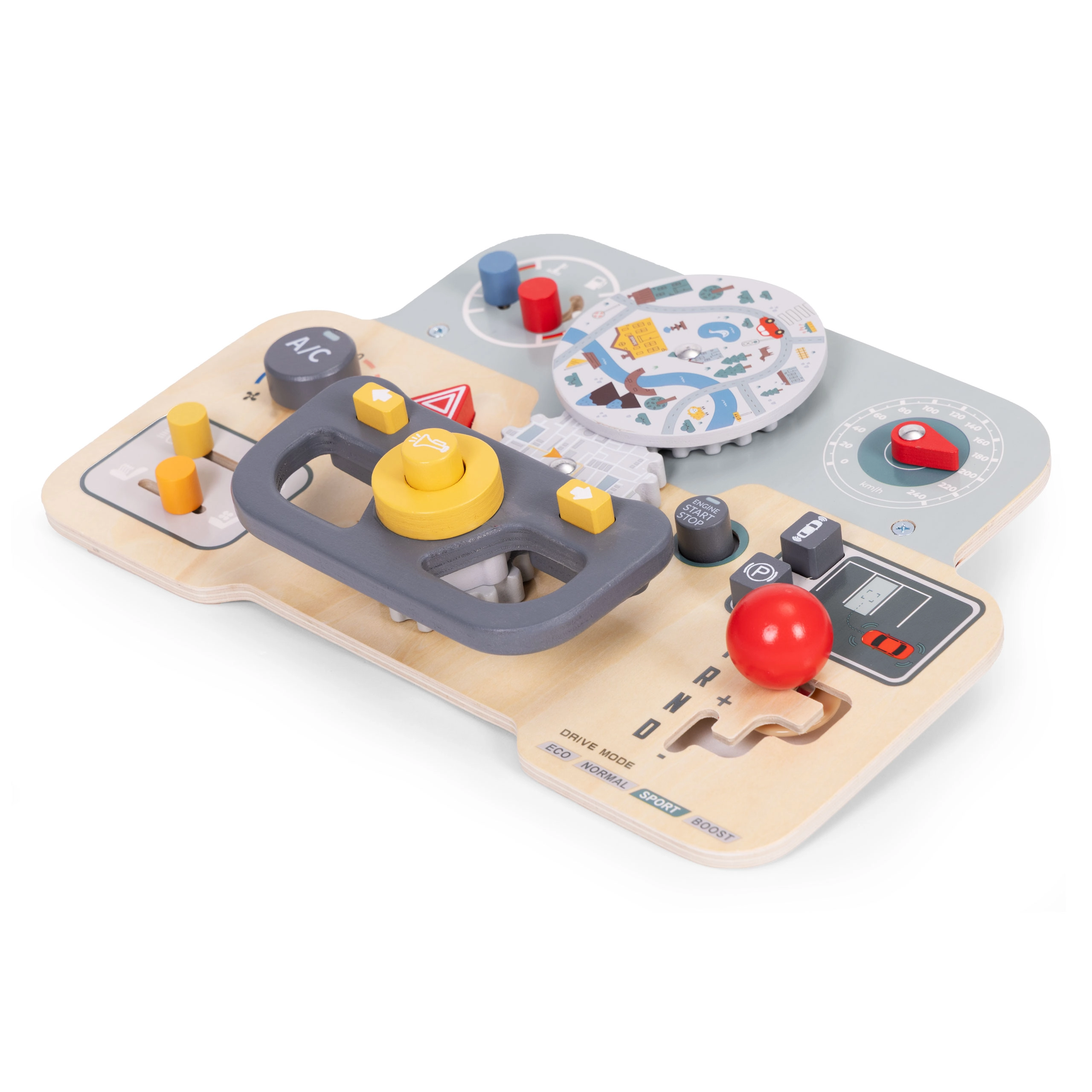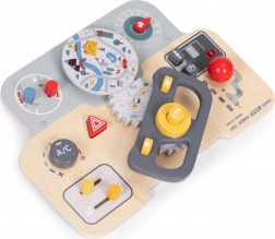 Ta lesena senzorična plošča zvesto posnema armaturno ploščo avtomobila in učenje spremeni v zabavno igro. Otroci lahko vrtijo volan, pritiskajo gumbe, premikajo stikala in raziskujejo različne upravljalnike – vse to podpira razvoj motorike, zbranosti in razumevanja vzroka in posledice.