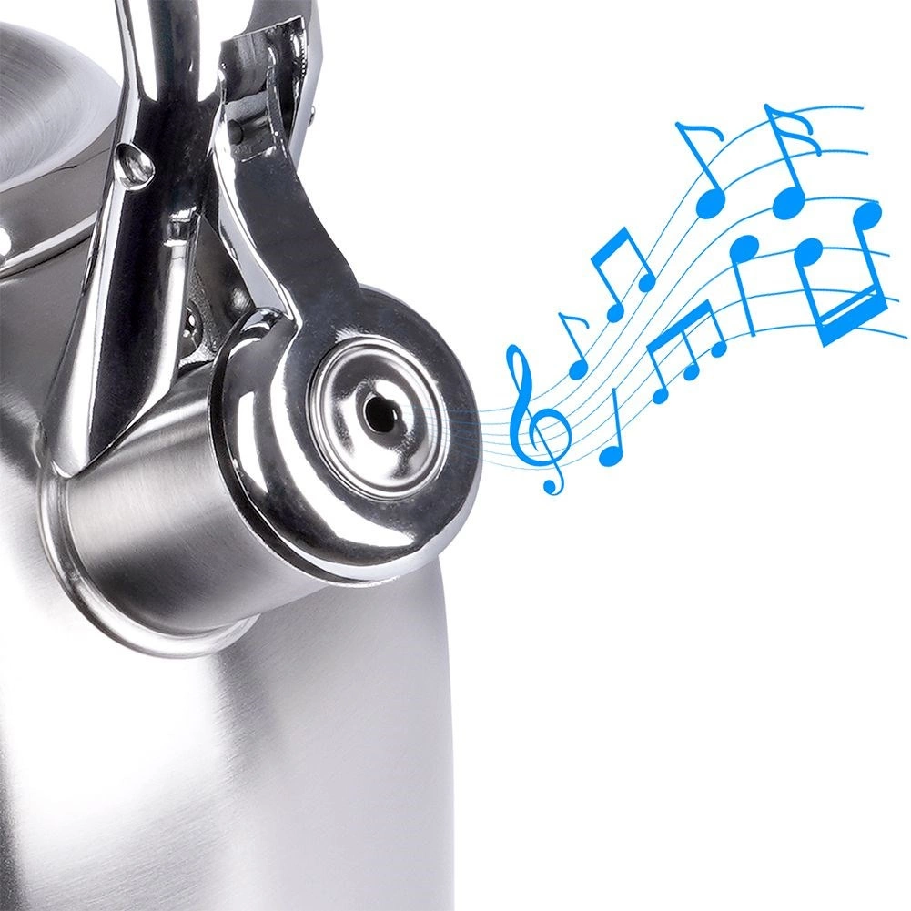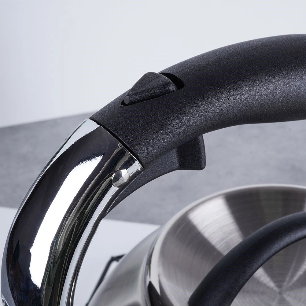 Vgrajena piščalka vas opozori ob vrelišču. Natančno oblikovan izliv z dvižnim pokrovčkom zagotavlja čisto in varno dolivanje.
