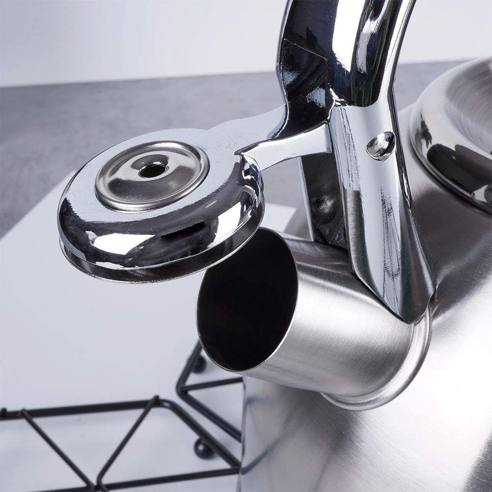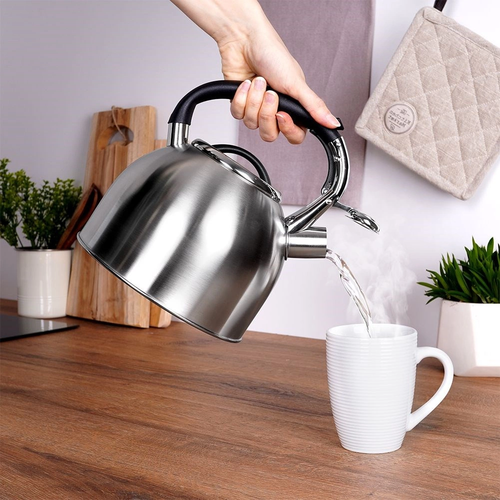 Odkrijte zanesljiv čajnik iz nerjavnega jekla, ki združuje brezčasen dizajn in praktične funkcije za vsakodnevno uporabo. Zahvaljujoč čvrstemu ohišju iz nerjavečega jekla se voda segreva enakomerno in hitro, medtem ko vas samodejna piščalka zanesljivo opozori na vretje. Ergonomski bakelitni ročaj se ne segreva in zagotavlja varno ter udobno nalivanje.