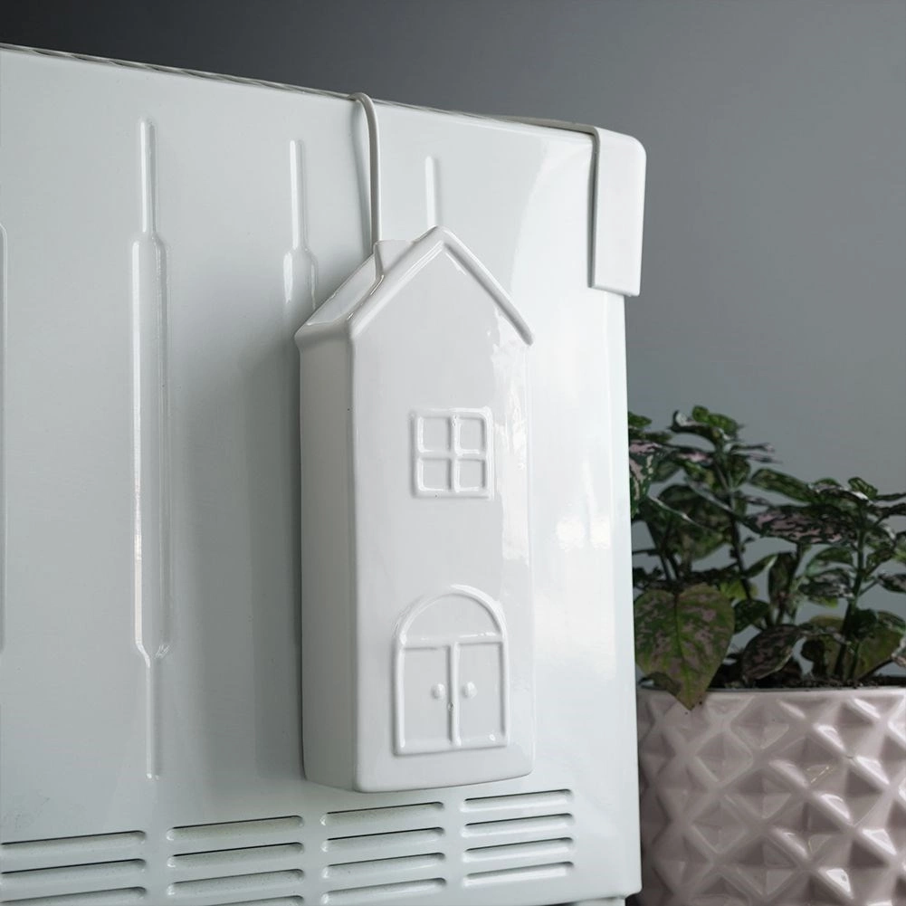 Eleganten keramični vlažilnik zraka za radiator v obliki hiške s prostornino 300 ml pomaga ohranjati optimalno vlažnost med ogrevalno sezono. Zahvaljujoč preprostemu obešanju na kovinski kavelj in enostavni uporabi je dovolj le dolivanje vode. Bela glazura in dekorativna zasnova se podata v vsak interier. Kakovostna keramika zagotavlja dolgo življenjsko dobo in varno uporabo.