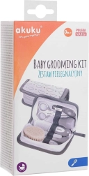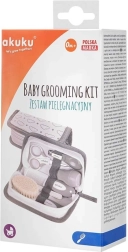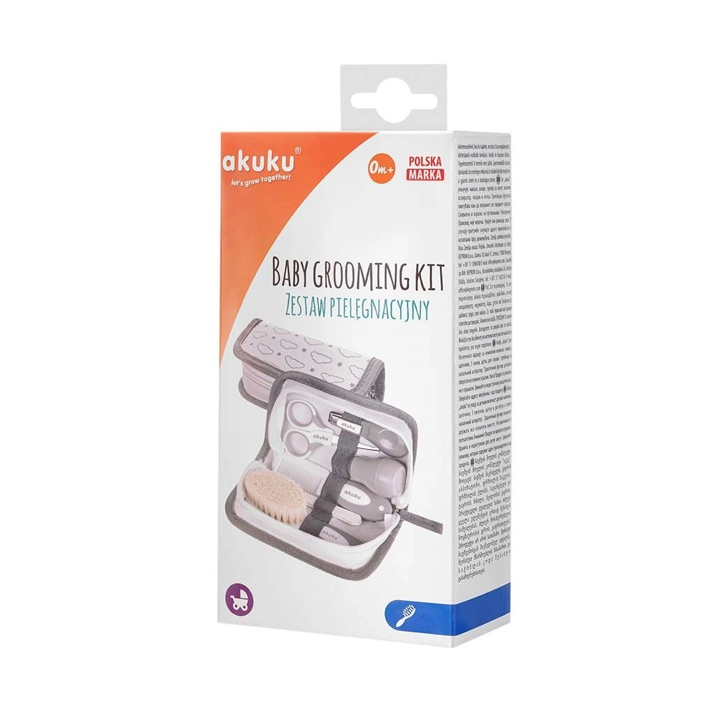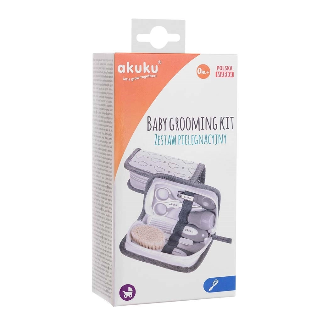 Praktičen začetni komplet za nego dojenčka Akuku Hooligans v tekstilni etui je idealen za novorojenčke in kot darilo. Vsebuje vse potrebno za varno higieno ter urejanje nohtov in las – škarjice z zaobljenimi konicami, kleščice za nohte, pilico, mehek krtaček iz naravnih ščetin, glavnik z nedrsečim ročajem in nosni aspirator z mehko konico. Brez BPA.