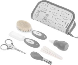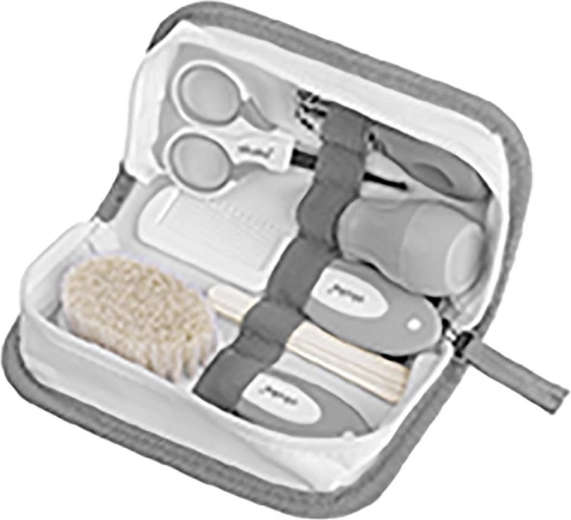 - Škarjice z zaobljenimi konicami, kleščice za nohte, pilica za nohte, krtačka iz naravnih ščetin, glavnik z nedrsečim ročajem, nosni aspirator z mehko konico