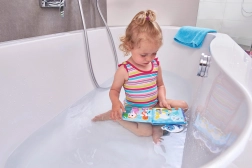 Lahka zasnova plava na vodi in je varna za igro v kadi ali bazenu. Otroci zlahka listajo ter odkrivajo barve in oblike.