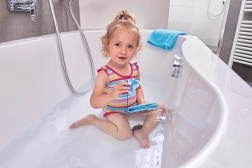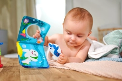 Sestavni del je zabaven piskajoč obesek, ki motivira k stiskanju, krepi fino motoriko in prinaša veselje ob odkrivanju zvokov. Knjižica plava na vodi in otroci jo lahko prelistajo kar med kopanjem.