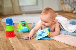 Vgrajen piskalnik vabi k stiskanju, razvija fino motoriko in uči razumevanja vzroka in posledice.
