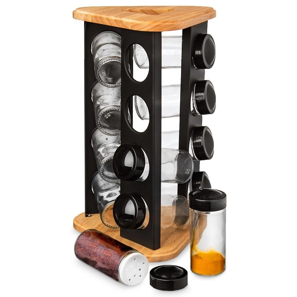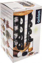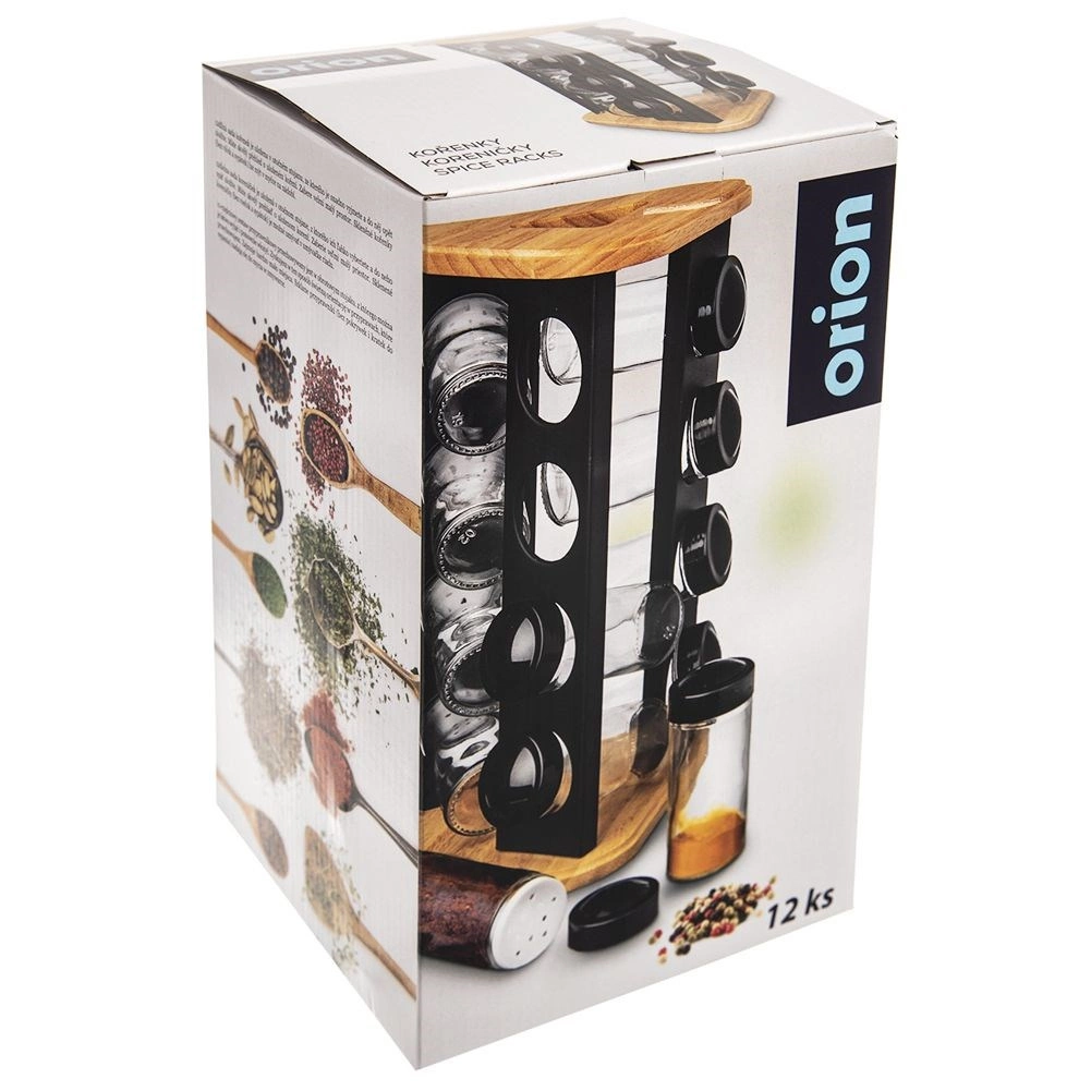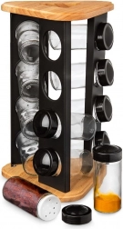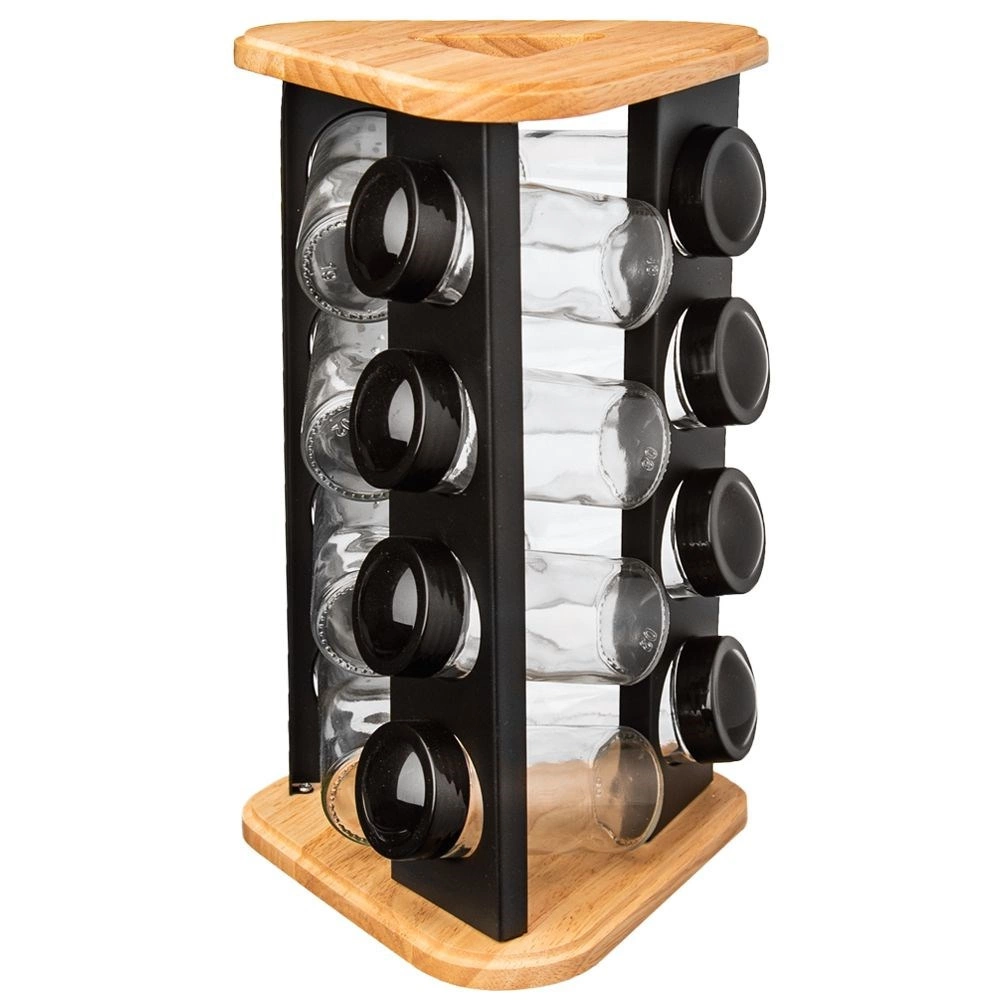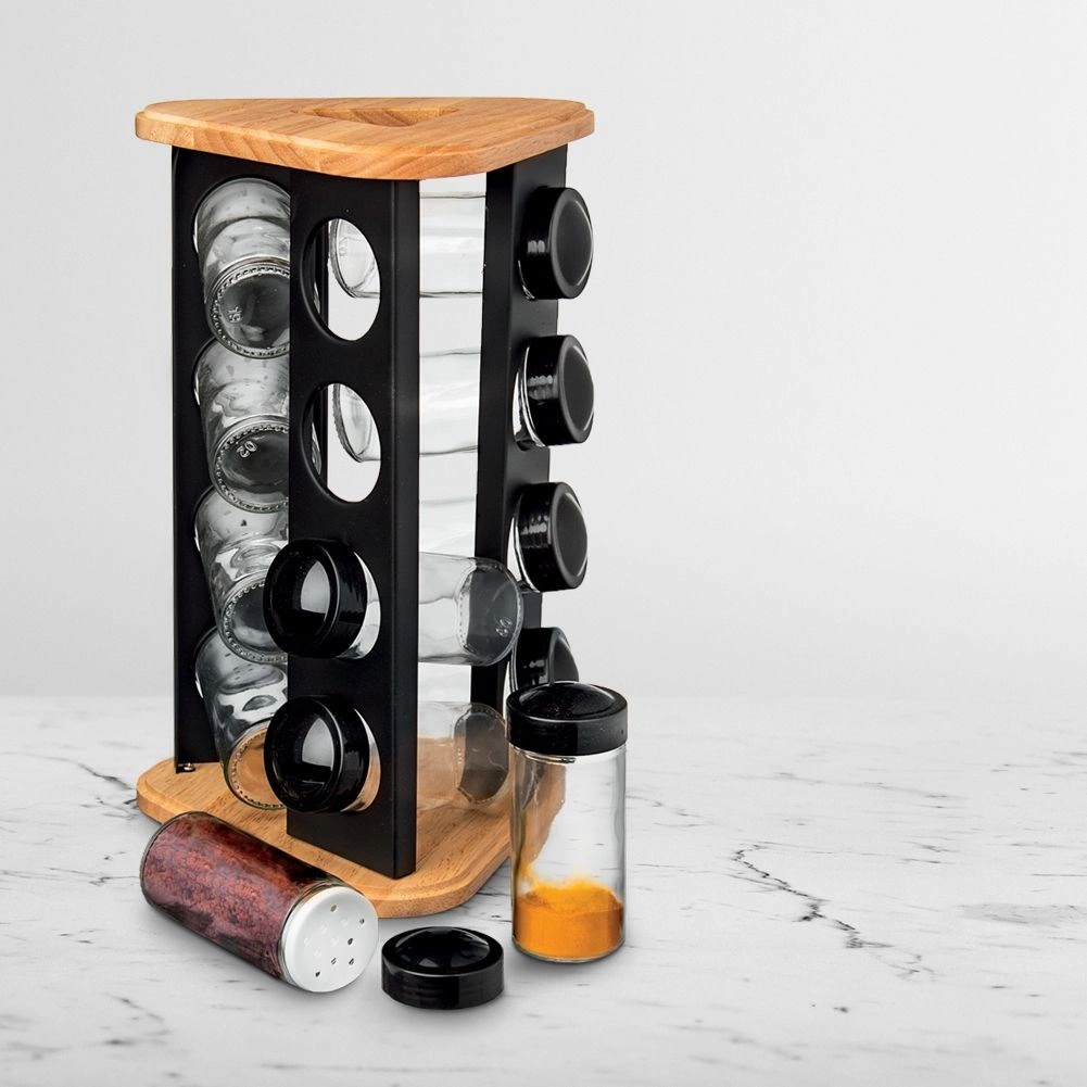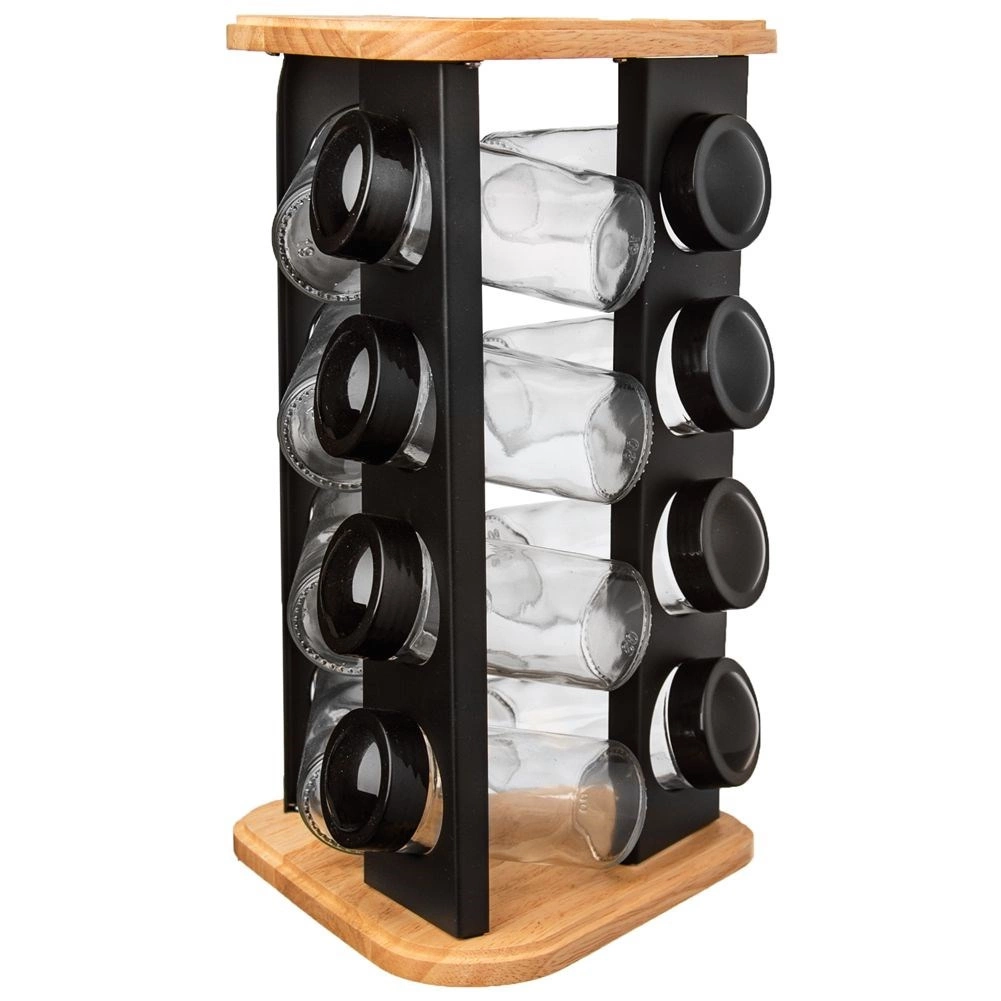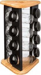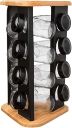 Stojalo iz lesa in trdnega črnega kovina je odporno in stabilno, prozorno steklo omogoča takojšen pregled nad vsebino. Steklene dele (brez pokrovčkov) lahko perete v pomivalnem stroju. Minimalističen dizajn se poda vsaki kuhinji ter pomaga ohranjati red in lepo predstavitev najljubših začimb.