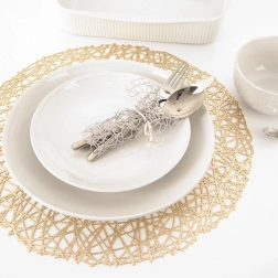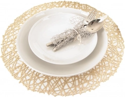 Ta okrogla podloga v zlati barvi je odličen dodatek za jedilno mizo ali klubsko mizico. Zaradi sijoče površine deluje izjemno elegantno in se zlahka kombinira s klasičnimi in modernimi interierji. Primerna pod krožnike, jedilni pribor in dekoracije, obenem pa zanesljivo ščiti površino mize.
