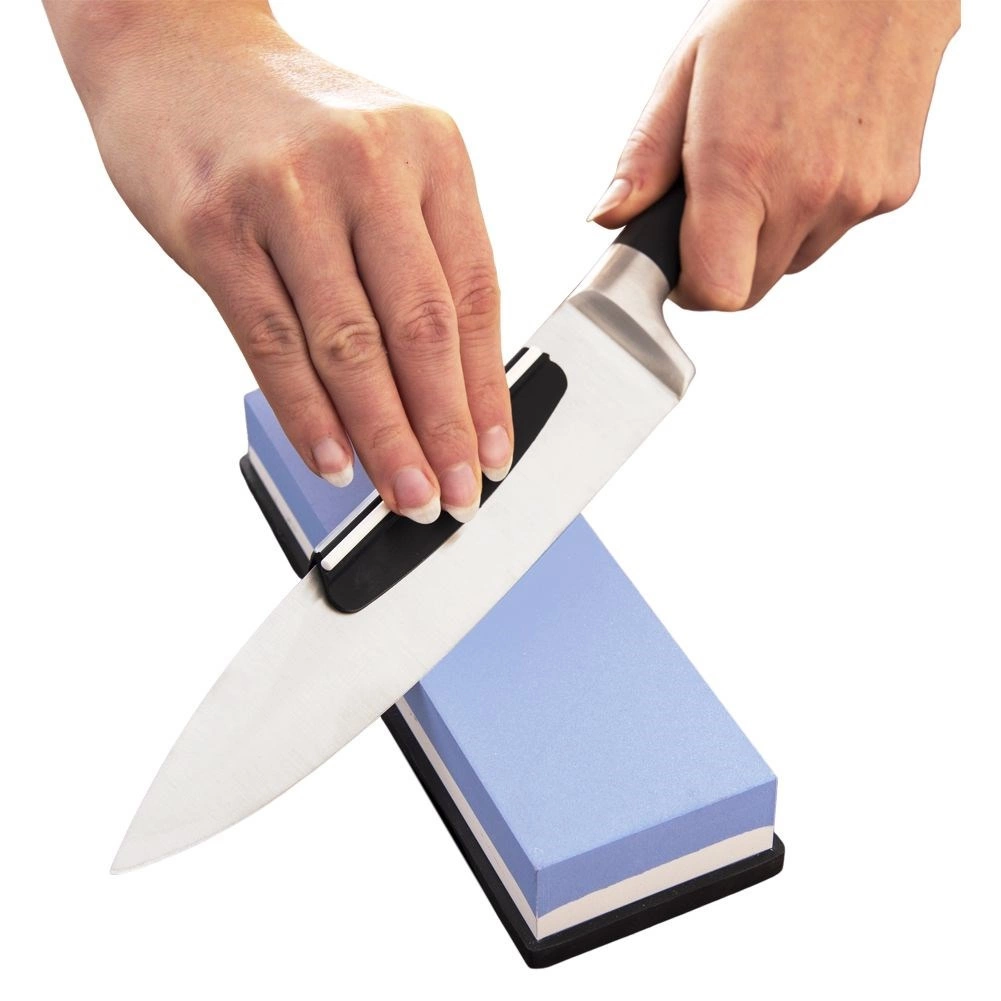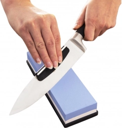 Set je primeren za kuhinjske nože, škarje, dleta in nekatere vrtnarske pripomočke. Pred uporabo je dovolj, da kamen približno 10 minut namočite in ga med brušenjem sproti vlažite. Material iz korunda je odporen proti obrabi in koroziji, zato nudi dolgo življenjsko dobo in stabilno delovanje. Ni primeren za nazobčane in keramične nože.