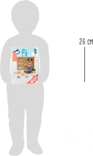 Odkrijte zabavno zabijalsko igro s piratskimi motivi znamke small foot, ki spodbuja ustvarjalnost, koncentracijo in fino motoriko. Zahvaljujoč prožni plutovinasti deski, zlatim žebljičkom in bogatemu izboru lesenih koščkov bodo otroci ustvarili edinstvene slike. Praktičen shranjevalni box in štiri dvosmerne kartice z motivi poskrbijo za preprosto shranjevanje in navdih za ustvarjanje.