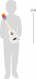 Stilska otroška kitara v beli barvi z barvnimi pikami je idealna za prve glasbene korake. Podpira razvoj ritma, učenje osnovnih akordov in glasbeni posluh ter je odličen dodatek za otroški bend in domačo igralnico.
