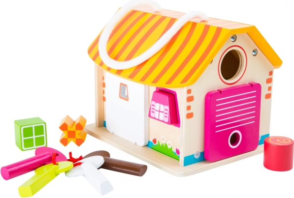 Ta lesena hiša je odlična za urjenje otrokovih motoričnih spretnosti. Vsak ključ ustreza drugim vratom. Zahvaljujoč elastikam ostanejo odprta. Opeke imajo različne oblike, ki jih je treba vstaviti v pravo odprtino. Za prenašanje hišice služi vrvica. Glavne lastnosti: vsebuje 9 kosov, urjenje motoričnih spretnosti, pisana izvedba
