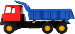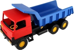 Robusten plastični tovorni avtomobil z modrim zabojnikom in rdečo kabino, dolg 75 cm, je idealna igrača za peskovnik in vrt. Ponuja funkcionalen nagibni zabojnik za realistično igro ter spodbuja ustvarjalnost, motoriko in zabavo na prostem.