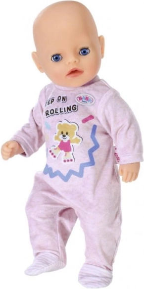 Dovolite svoji punčki, da počiva v slogu. Ta mehak pajac BABY BORN Little 36 cm v nežno rožnati barvi ima igriv potisk »Keep on rolling« z medvedkom in všite nogavičke, da punčki nikoli ne zebe v nožice. Zahvaljujoč ohlapnejšemu kroju ga lahko enostavno oblečejo in slečejo tudi manjši otroci.