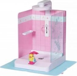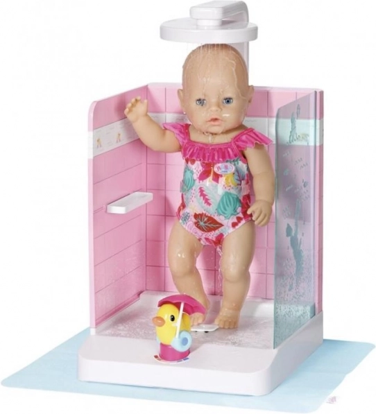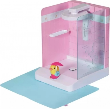 Praktično držalo za punčko varno drži dojenčka BABY born ali starejšega sorojenca na mestu, nastavljiva višina prhe pa se prilagodi obema velikostma. Priložena je tudi podloga proti škropljenju, ki ohranja okolico suho. Eleganten dizajn z rožnatimi ploščicami se odlično ujema z dodatki iz kolekcije Kopalnica.