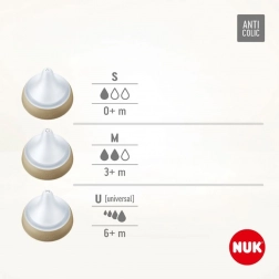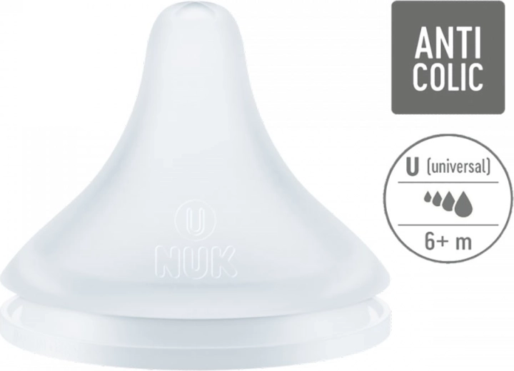 NUK Perfect Match Universal je zasnovan za naraven in varen prehod med dojenjem in hranjenjem po steklenički. Mehki silikonski material je nežen do občutljivih dlesni, gladko ožajoča se oblika pa podpira pravilno sesanje. Zahvaljujoč antikolični funkciji je zagotovljen enakomeren in nemoten pretok, ki pomaga preprečevati napihnjenost.