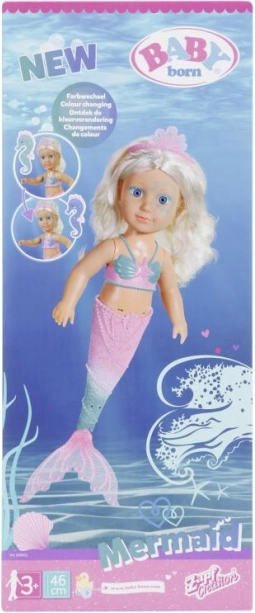 Čarobna punčka BABY born morska vila, visoka 46 cm, prinaša zabavo v vsako kopel. V vodi ima premično plavut, njena obleka pa ima učinek spreminjanja barve v hladni vodi. Zaradi dolgih blond las z barvnimi prameni in dodatkov boste uživali v ustvarjalnem česanju – priložena sta naglavni trak in roza glavnik. Punčka je na baterije in spodbuja domišljijo ter socialne veščine.