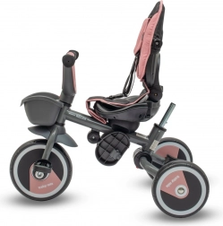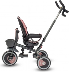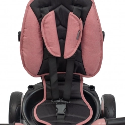 Ta tricikel združuje udobje, varnost in prilagodljivost. Vrtljiv in pomičen sedež z nastavljivim naklonom naslona omogoča vožnjo v smeri ali proti smeri vožnje, medtem ko pet-točkovni pasovi in odstranljiv varnostni lok zagotavljajo maksimalno zanesljivost. Velika zložljiva strešica z okencem ščiti pred soncem in omogoča, da imate otroka vedno na očeh.