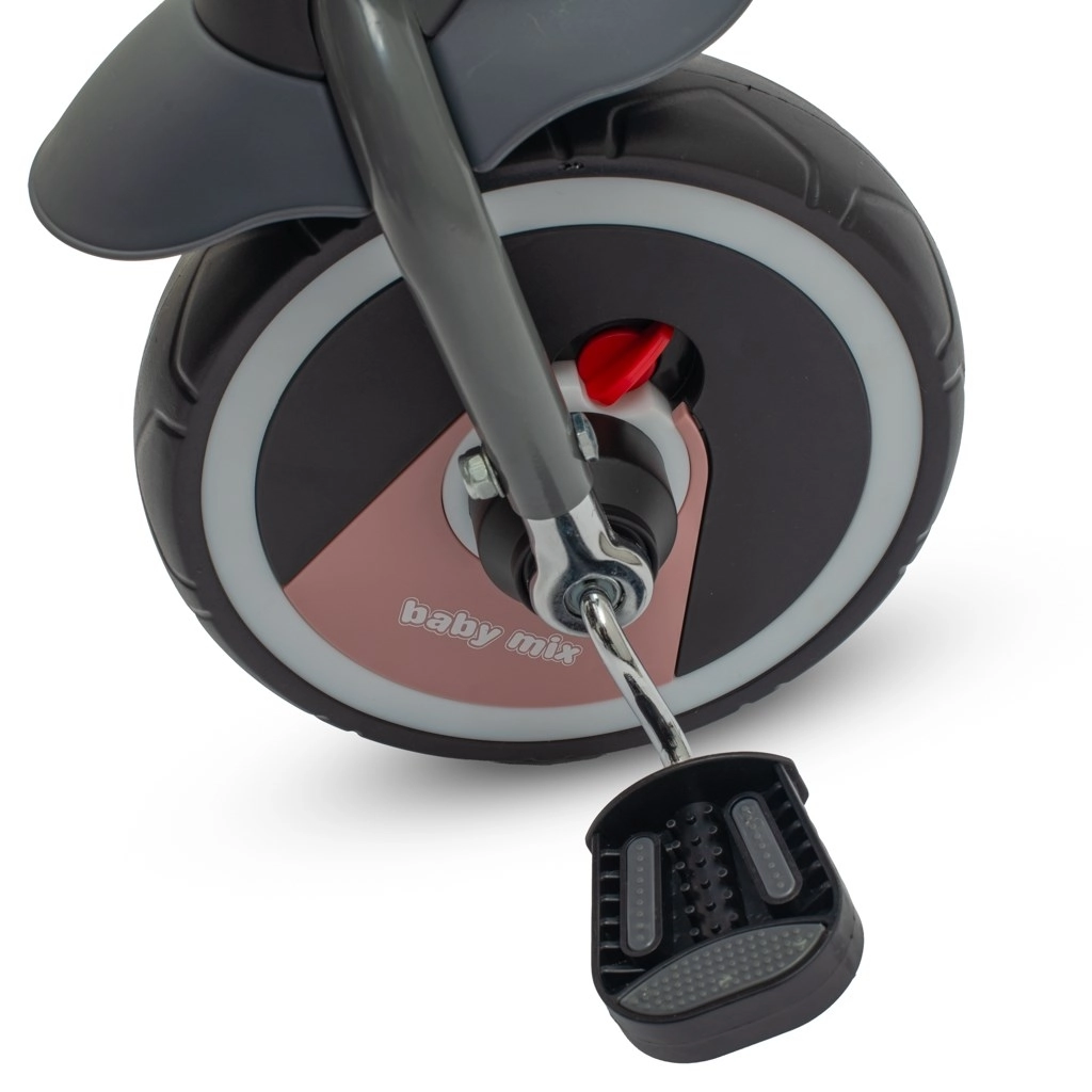 Robusten jeklen okvir in kolesa iz utrjene EVA pene zagotavljajo stabilnost, odličen oprijem in ne zahtevajo napihovanja. Funkcija prostega teka, nožne zavore na zadnjih kolesih in sprednji blatnik prispevajo h komfortu in nadzoru. Zahvaljujoč zložljivi konstrukciji tricikel enostavno pospravite v prtljažnik avtomobila.
