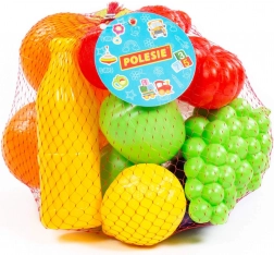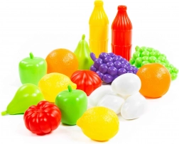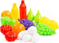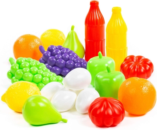 Set vsebuje grozdje, jabolka, citruse, paradižnike in druge kose, ki spodbujajo domišljijo ter učijo otroke prepoznavati vrste živil in barve.