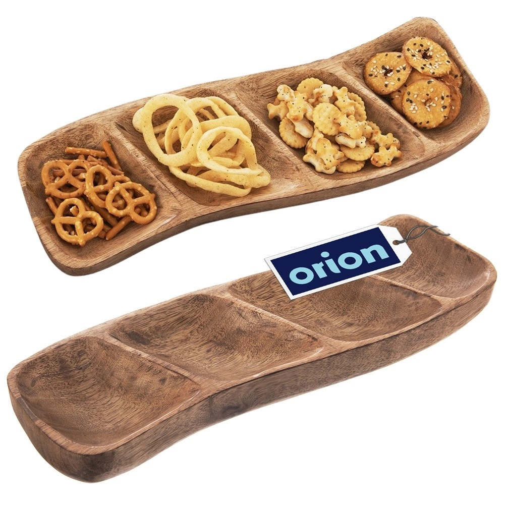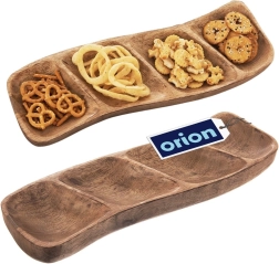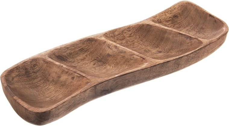 Eleganten lesen servirni pladenj s 4 predelki iz trpežnega mangovega lesa. Ročno izdelan, z naravnim vzorcem in vsestransko uporabo za oreščke, olive, suho sadje, dipse in omake. Slogovna predstavitev prigrizkov doma in v restavraciji.