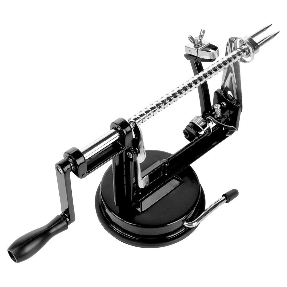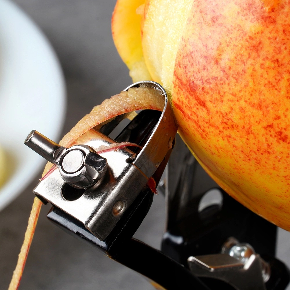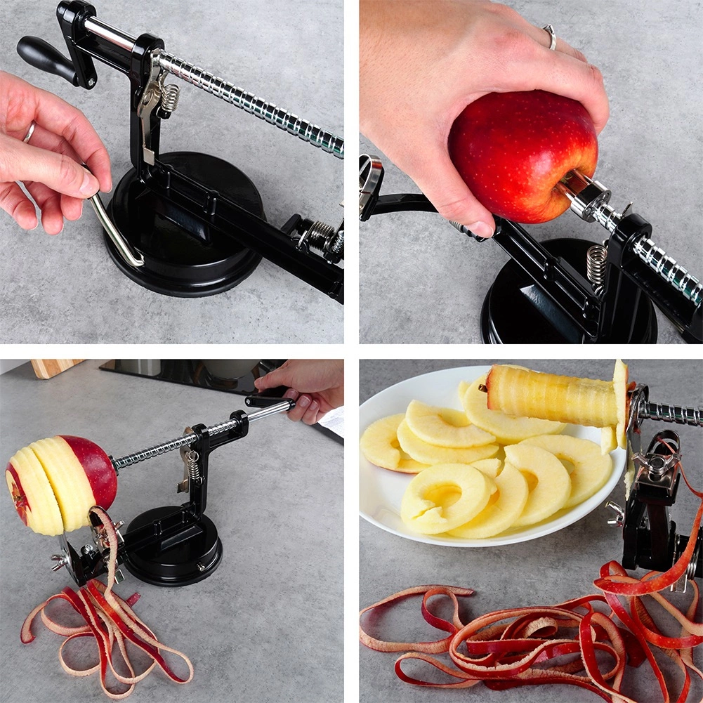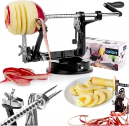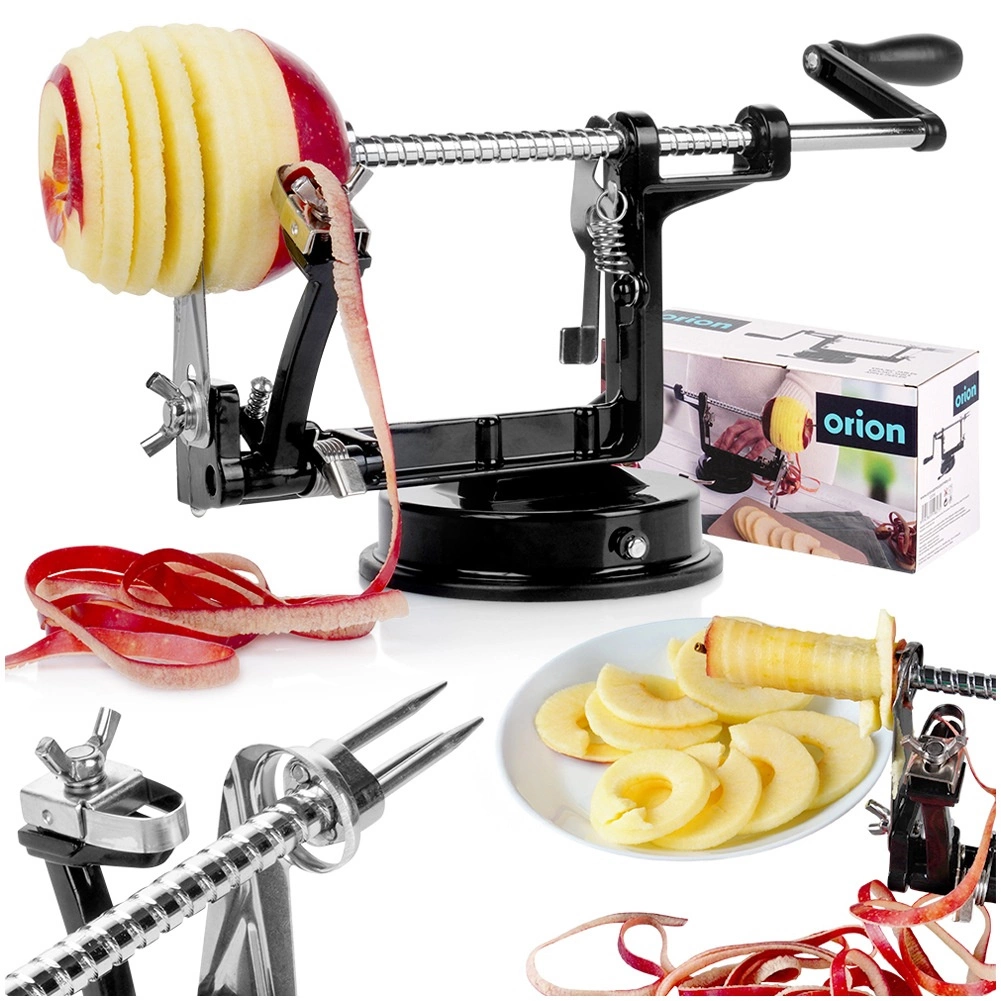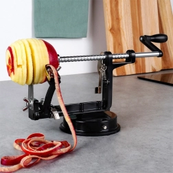 Praktičen kuhinjski pomočnik, ki v enem koraku olupi, izreže sredico in nareže jabolka, hruške ali krompir na učinkovite spirale. Zahvaljujoč natančnemu vodenju in ostrim nožem dobite enakomerne rezine, idealne za zavitke, hrustljav čips, sušenje ali dekorativno postrežbo.
