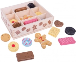 Lesena škatla s piškoti za igranje je polna okusno izgledajočih lesenih poslastic. Idealno za male kuharje, ki želijo odkriti čar peke in kuhanja.